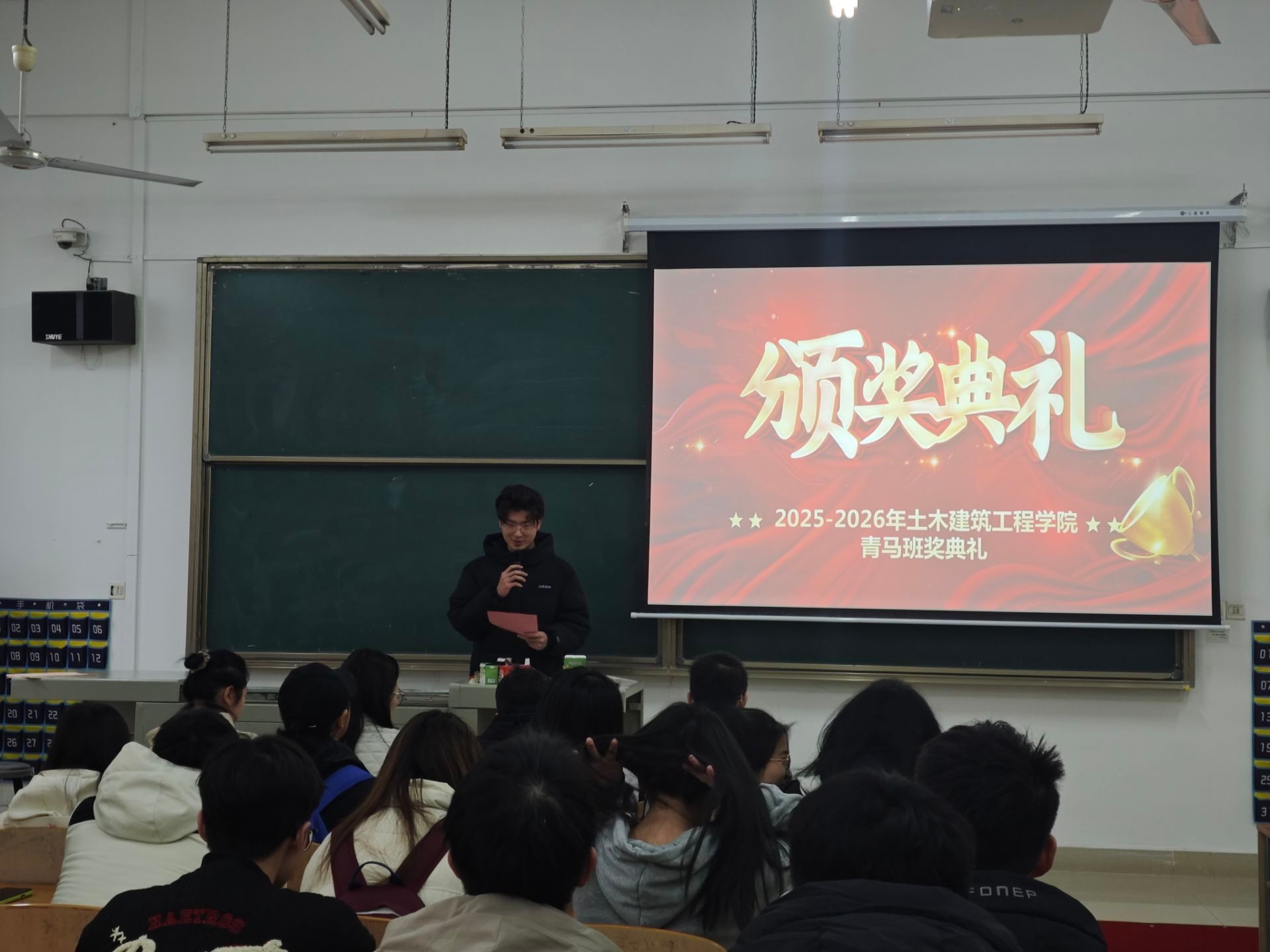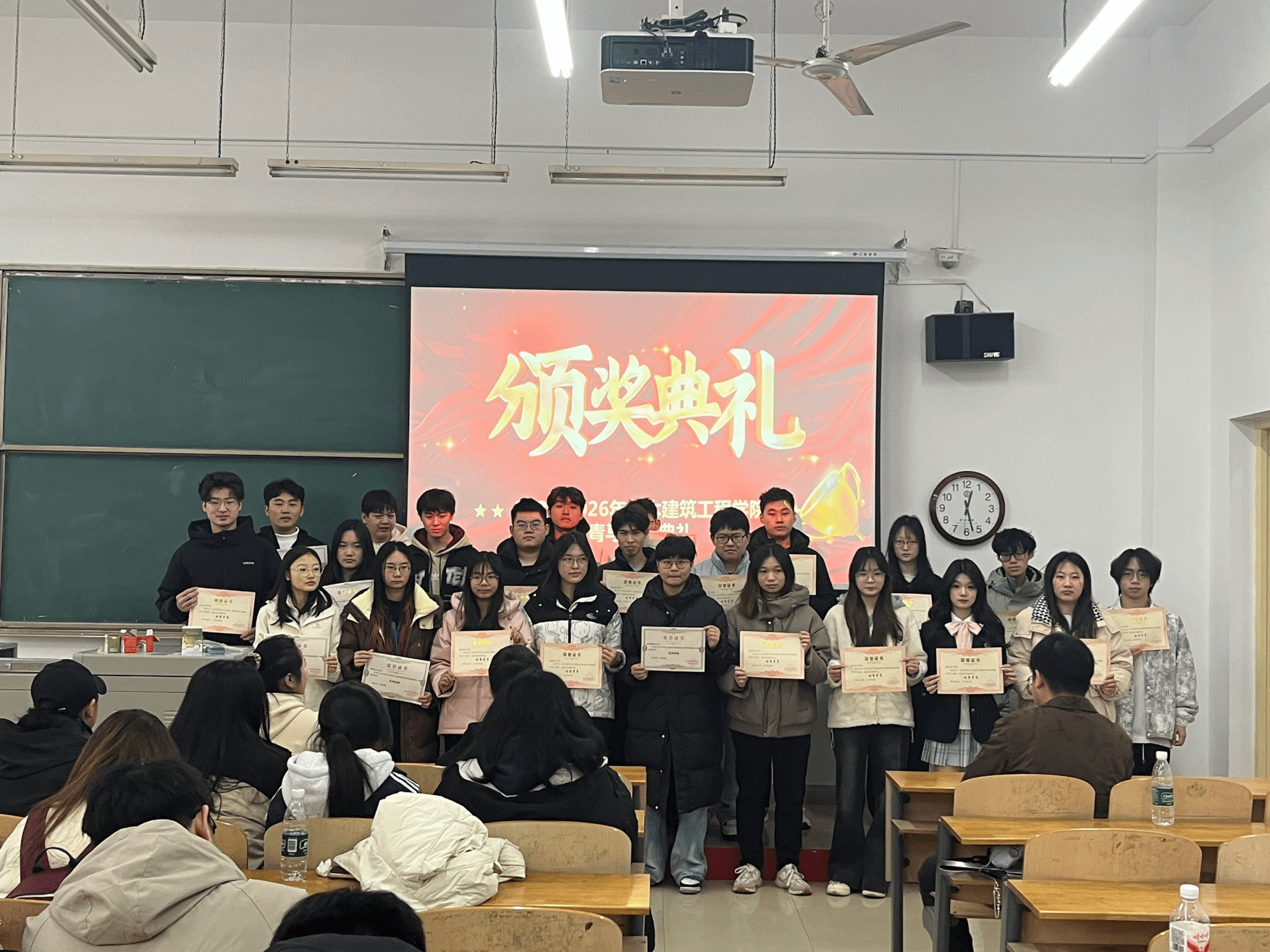 随后徐书记进行讲话,4次课的青马班培训短暂却充实,这段旅程,是思想的淬炼,是能力的锻造,更是信仰的加固希望我们以此为新的起点,将“青马”所学所悟,真正转化为实干笃行的强大动力,在服务同学、奉献校园的实践中持续发光发热,努力成长为信仰坚定、能力突出、素质优良、作风过硬的新时代青年政治骨干。书记也向大家提出三点希望:第一,希望青马学员做知行合一的“火种”第二,希望受表彰班级做文明风尚的“标杆”第三,希望全体同学做校园文明的“主人” ,颁奖典礼最后所有获奖人员进行合影留念。