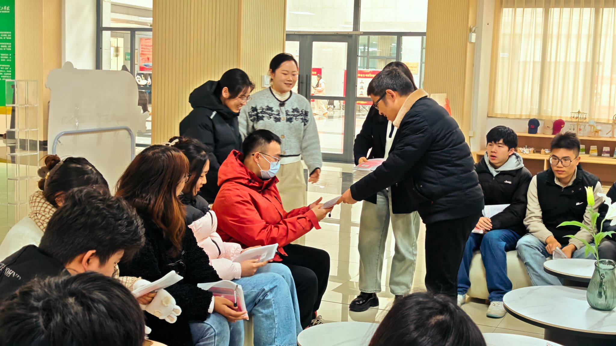 徐双立副书记在派发过程中,与学子们亲切交谈,仔细询问复习进度与心理状态。他目光坚定而温和,话语如春风化雨:“最后阶段,要稳住心态,按计划复习,坚持就是胜利。你们不是一个人在战斗,学院永远是你们坚强的后盾。你们一路走到现在,已经无比优秀,努力了无论结果如何,你们都是最棒的!”辅导员黄呈和昌仪琳则结合自身经验,分享备考技巧与心态调整方法,为同学们答疑解惑,他们的耐心与专业,让学子们吃下了一颗“定心丸”。