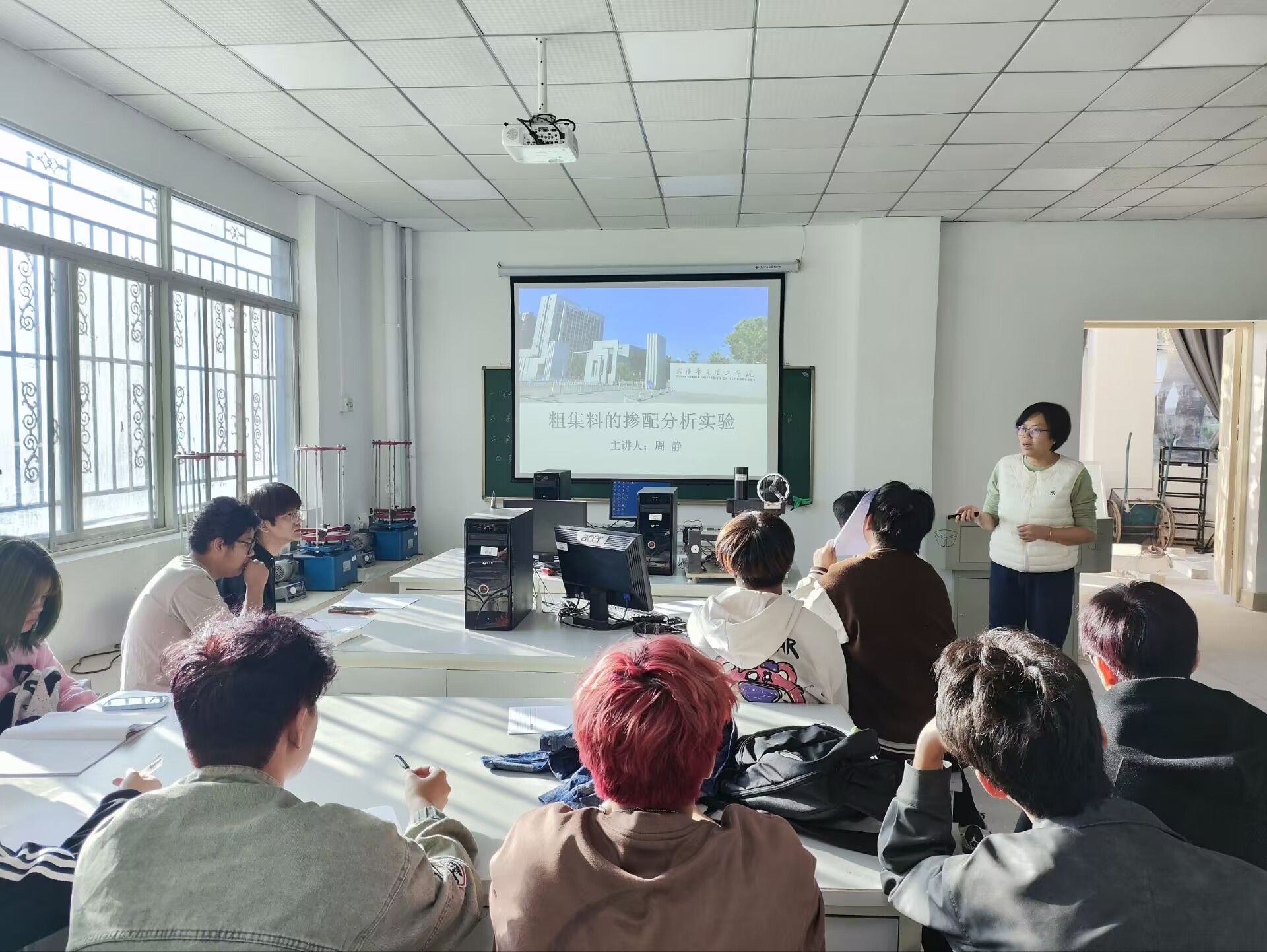 随后,同学们分成3组进行了粗集料的筛分操作,每组需完成(5-10)mm和(10-20)mm两档集料的筛分。最后通过Excel表格法调整这两档粗集料比例,模拟不同的配合比,以确定最佳的级配设计方案。