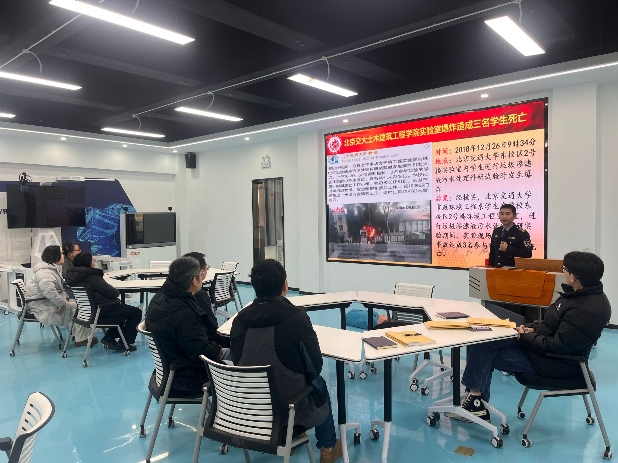 王教官围绕实验室常见事故、日常防火与灭火、紧急情况下逃生与自救等环节,结合现实中鲜活的案例,分别通过图片、短视频和现场互动问答加以剖析讲解,触目惊心的火灾场面令老师们印象深刻。