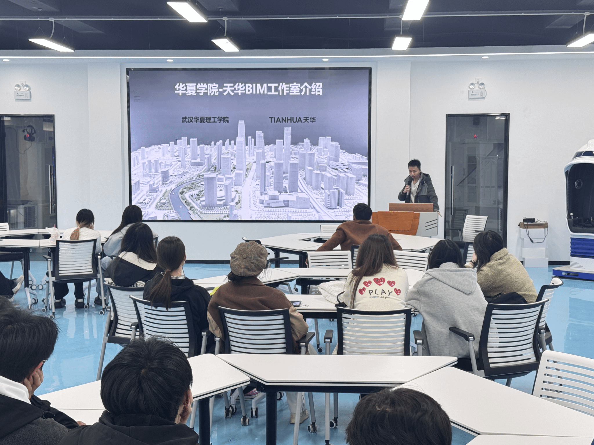 2025年4月2日晚,BIM工作室在5号实验楼514实验室举办BIM工作室专题宣讲会。会议由工作室指导老师马誌豪主持,武汉天华华中建筑设计有限公司校企合作负责人李拓受邀出席,为到场学生详细介绍BIM工作室与企业的合作成果及培养模式。
