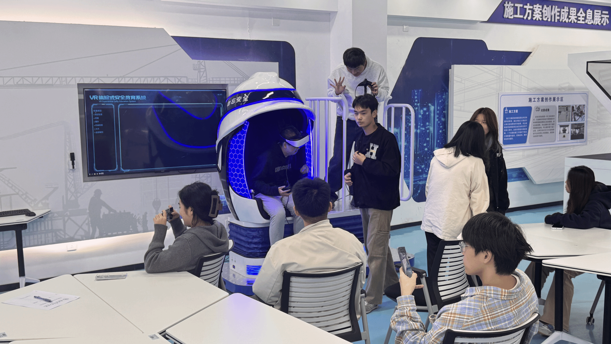 在智能施工安全VR教育的区域中,马誌豪老师为大家简单阐述了智慧施工安全VR实践仪器,仪器中包含国内外施工现场各类施工安全问题,如物体打击,高处坠落,地震等。不少同学跃跃欲试,争着去体验一把,仪器中1:1还原施工现场,让大家更深刻地了解到工地的概况及安全隐患,提高自己的安全意识,将事故的风险扼杀在摇篮之中。
