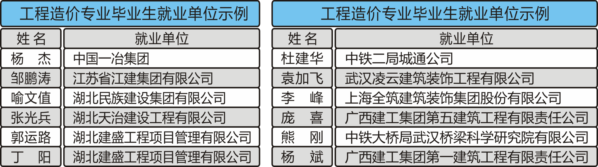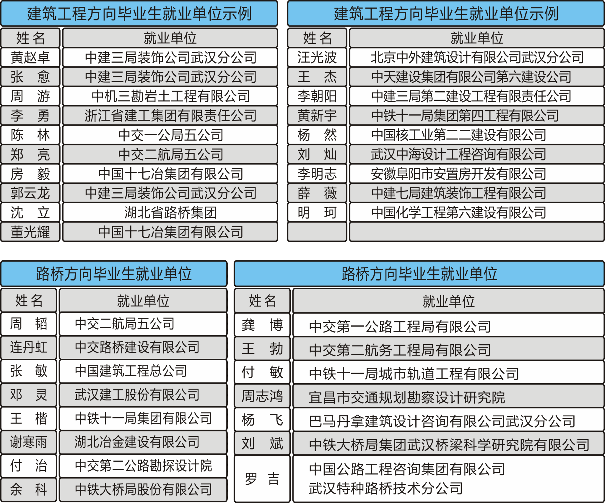 毕业生连续三年就业率均在90%以上,专业对口就业率超过90%,国企就业率近40%,毕业生深受中交二航局、中建三局、中国一冶、中铁大桥局等大型国企单位欢迎。涌现出一批就业先进典型人物。 考研录取率平均在10%左右,277名学生考取武汉大学、华中科技大学、武汉理工大学、日本名古屋工业大学等国内外知名学府研究生。