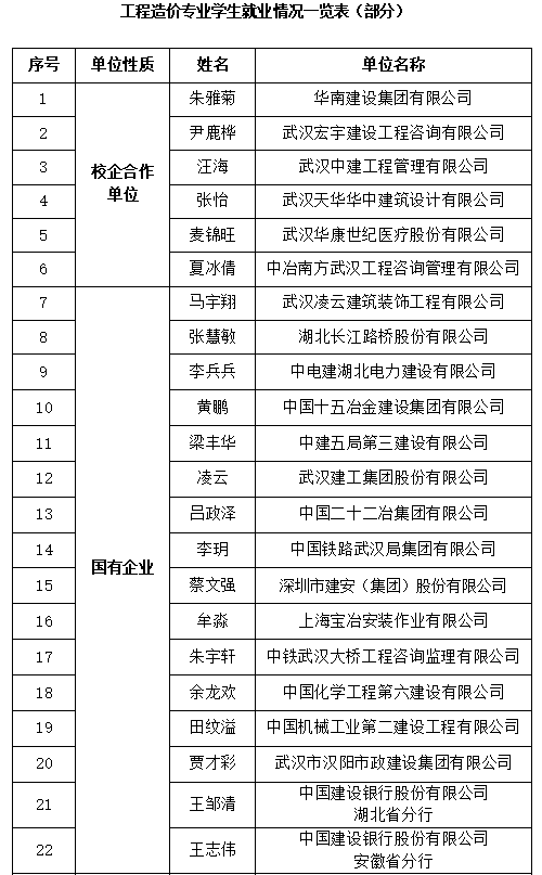 现共建有20余个校外实习、实训和产学研基地,主要包括中冶南方武汉工程咨询管理有限公司、武汉天华华中建筑设计有限公司、湖北大有工程咨询有限公司、中乾立源工程咨询有限公司、中德华建国际工程技术有限公司等。校内和校外实习实训基地是学生实践能力培养的重要平台。为本专业学生的认知实习、生产实习和综合实习等提供真实的工程环境,帮助学生熟悉行业规范和流程,积累实践经验,提升职业素养,增强就业竞争力。为全方位培养学生的应用能力、创新能力及工程素养提供有力保障,实现人才培养与市场需求之间的有效衔接。