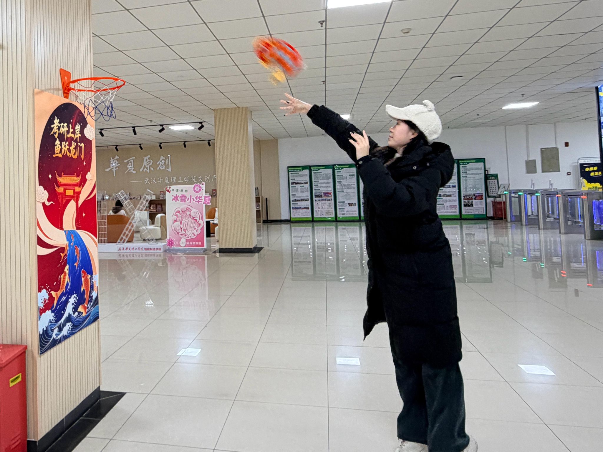 “起身一投,松压焕能”的运动局名副其实,同学们奋力将锦鲤玩偶投向篮筐。“坐了一上午,肩膀都硬了。投了三球,出了一身汗,脑子反而清醒了!”制药学院的陈同学说,“这种小游戏看似简单,但真的能让人从题海里暂时‘浮出来’喘口气。动一动,真的能续命。”