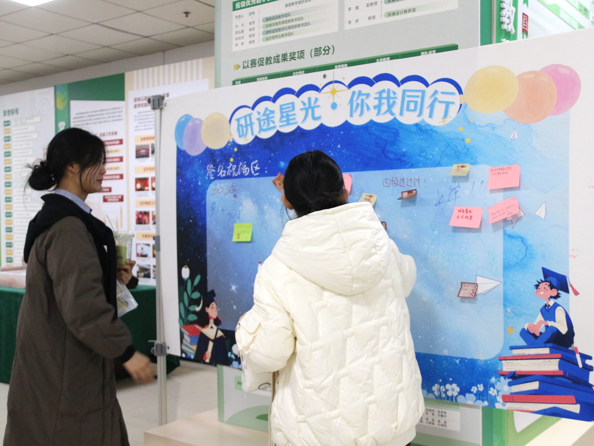 “执笔为誓,一战成硕”的许愿局温情满满,签名板上,绘签与便利贴交织。“华中科技大学,等我!”、“坚持到底,你就是黑马!”、“致未来的研究生:你值得!”等真挚留言比比皆是。许多同学不仅签下自己的名字,还主动为其他考研同路人写下鼓励便笺。这一刻,梦想从笔尖落地,被时光见证。