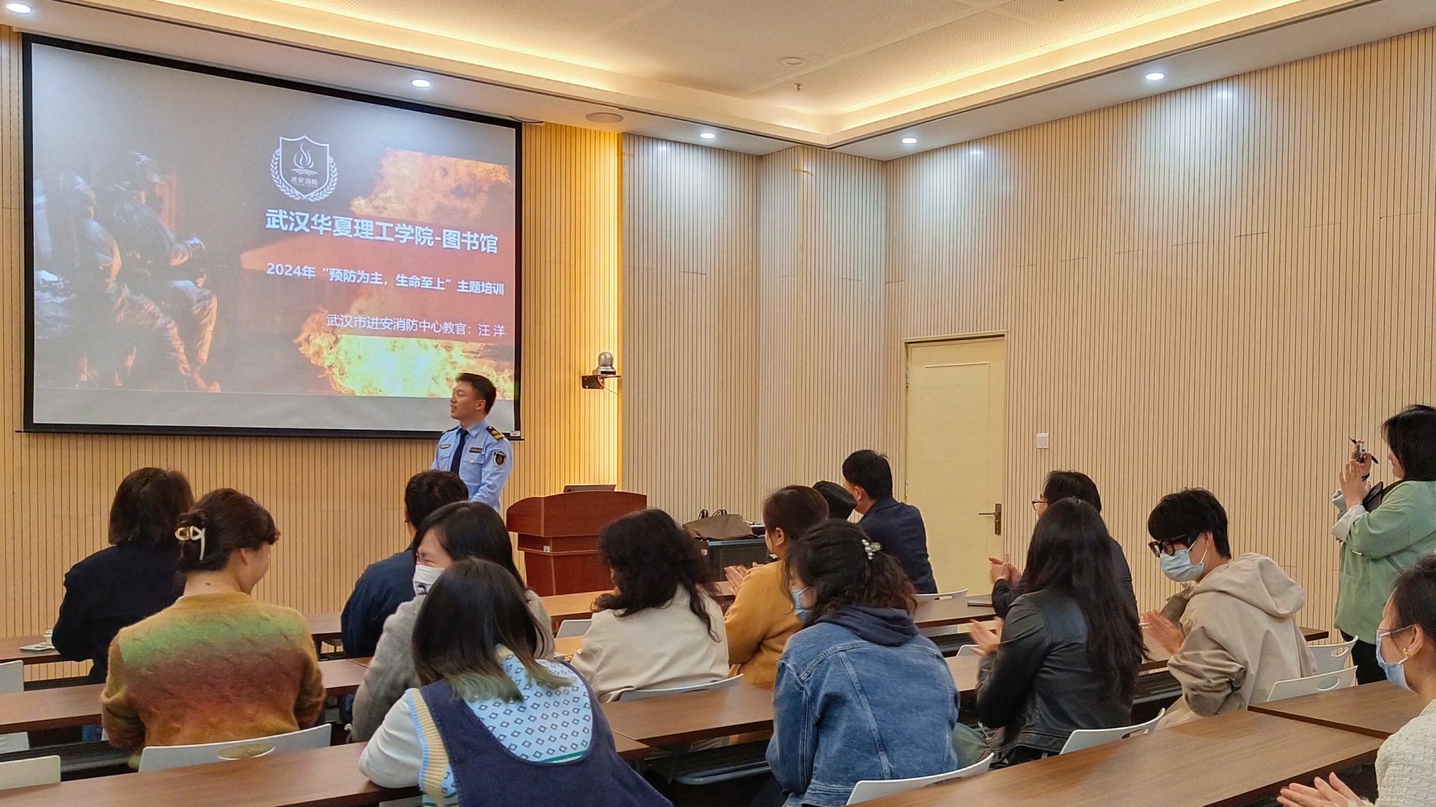 武汉市进安消防中心汪教官通过大量火灾事故现场视频,向在座教职工讲述了用电安全,家庭消防知识、燃气安全使用、排查火灾隐患,并分析火灾发生的原因,指导大家如何正确应对初起火灾,发生火情后如何进行逃生自救等知识。针对近期各地高层火灾频发,汪教官还着重介绍了高层逃生应该注意的事项和应急处置流程。
