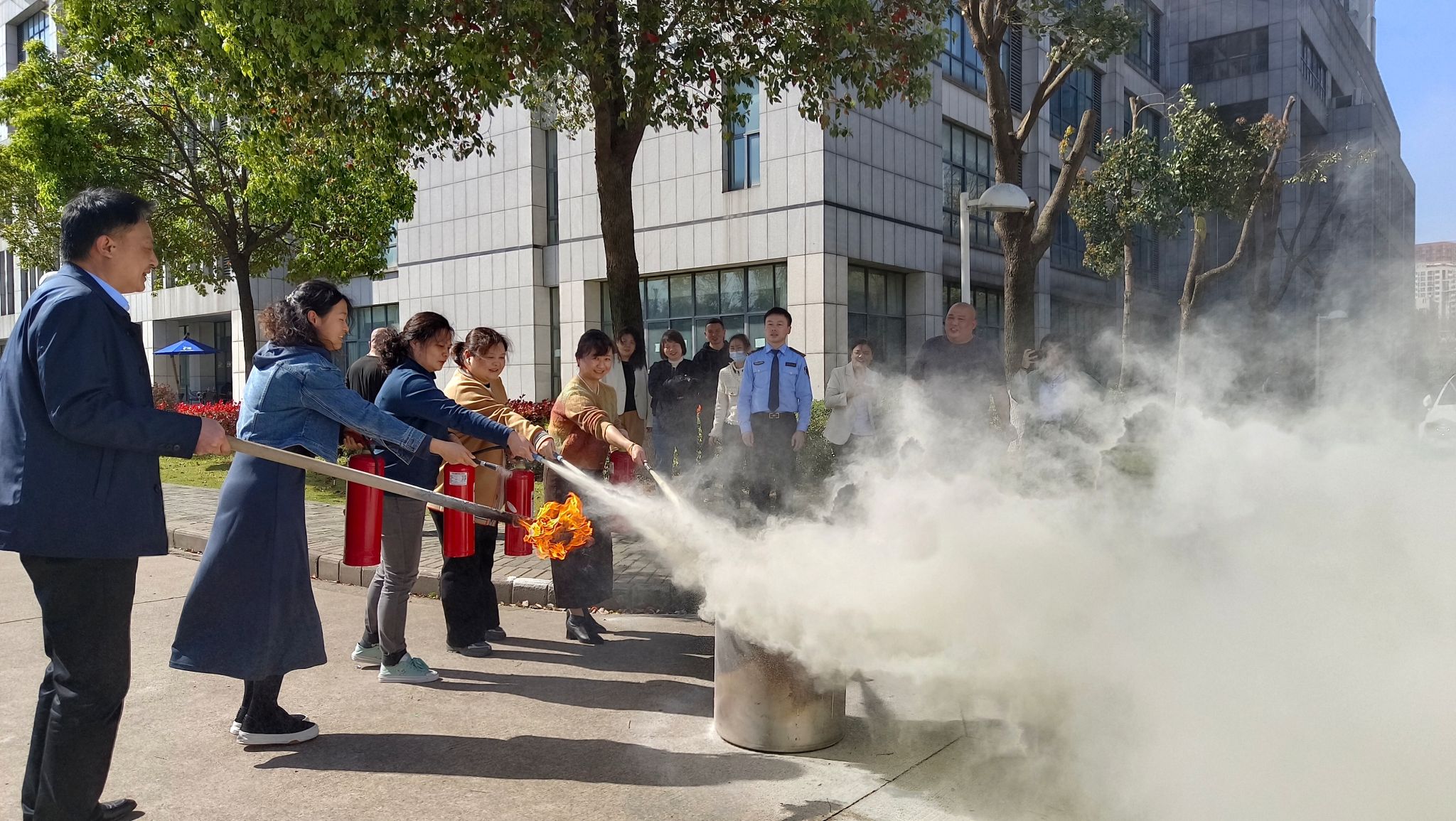安全知识讲座结束后,全体参加培训人员对图书馆各处消防设施分布情况、工作流程及使用方法进行了全面了解。保卫部部长叶志强提醒大家切勿在消防设施、各通道口旁堆放杂物。随后,根据疏散逃生应急预案,在图书馆二楼书库使用烟雾弹模拟火灾发生,参加培训人员从消防安全通道有序撤离,全程秩序良好。在灭火演练现场,汪教官先行演示了灭火器和消火栓的正确使用方法和注意事项,随后参加培训人员一一上前进行了灭火实践。