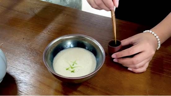 碾茶、热盏、击拂……茶汤乳雾汹涌,溢盏而起,点茶过程行云流水,美轮美奂,同学们不时发出惊叹。随后在老师的指导下,大家纷纷亲自尝试点出一杯茶,感受穿越千年的风雅。