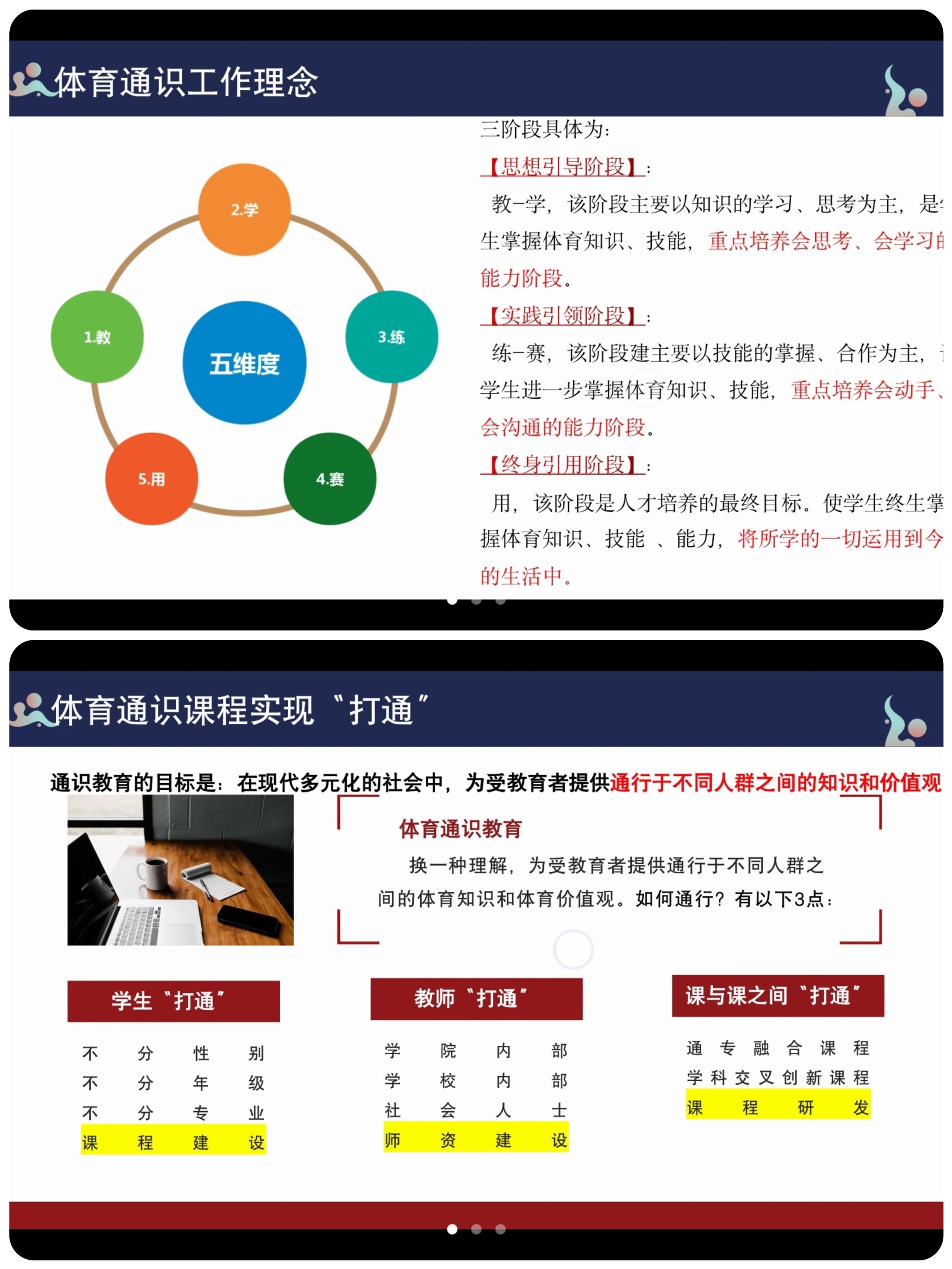 随后,张莉萍从优质核心课程、核心课程、一般课程三个方向对体育通识课程设置进行详细讲解。强调建立体育通识课程体系是公体课部的重心工作,我们要找到课程创新和特色路径方向。以华夏体育工作高质量发展为目标,夯实课程建设,创建华夏体育通识IP。