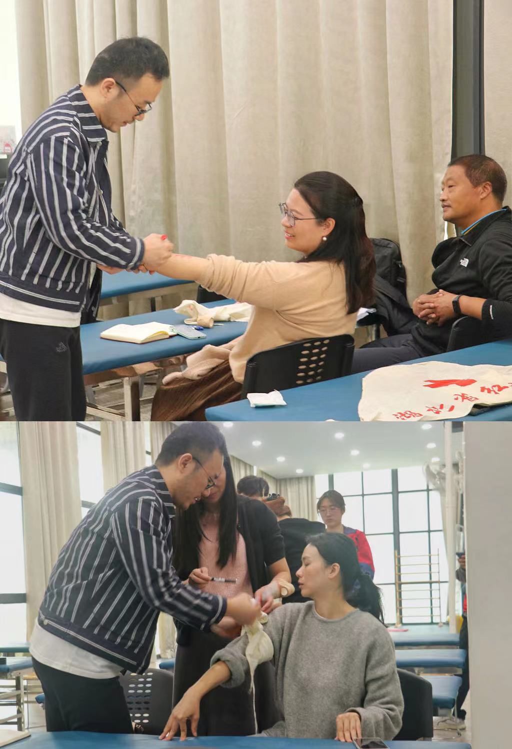 接着,在场的各位老师纷纷实践操作,体育学院运动防护小组的张宪武和唐俊杰同学协助自己的专业老师进行练习。操作过程中闫老师耐心指导,解答疑问。针对心肺复苏的操作,彭晶老师问道:“五次按压循环后若伤员仍无意识,应该怎么办?”闫成龙回答:“持续进行心肺复苏,等到高级生命支持也就是救护车到来。”