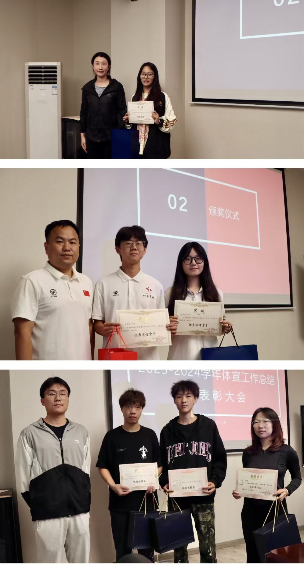 会议伊始,宁梦茹老师讲述了此次会议的目的,同时回顾了上一学年体育学院宣传中心的工作,并对新学年的宣传工作纲领及计划进行了部署。随后,毛峥毅书记为获奖教师宁梦茹、付炜、叶航、古雅辰、付炜、肖青老师颁发了优秀宣传教师荣誉称号,随后再由体育学院各部门负责人为优秀学生颁布了优秀宣传模范、优秀宣传骨干、优秀宣传员等称号,以鼓励他们在过去一学年为学院宣传工作所作的贡献。