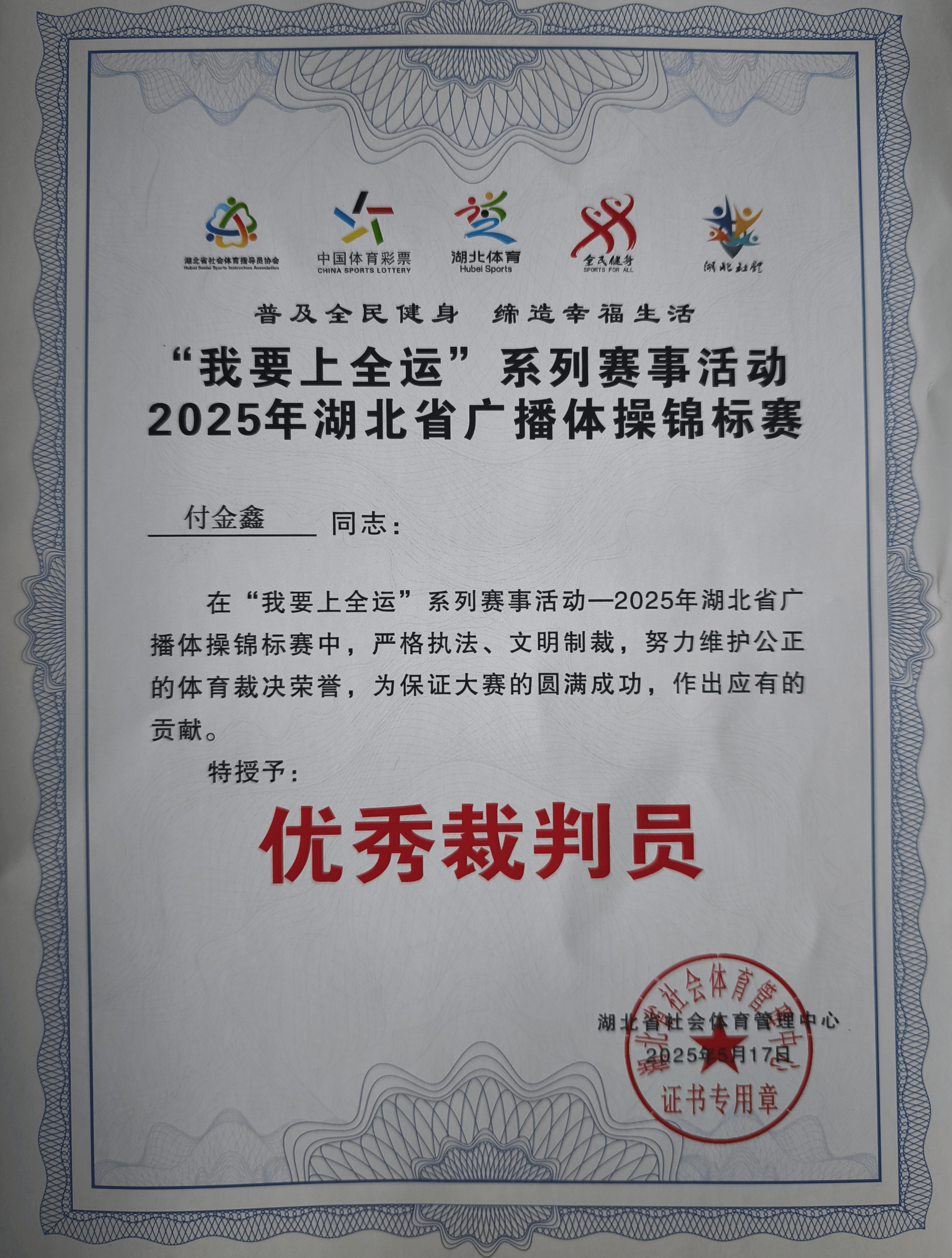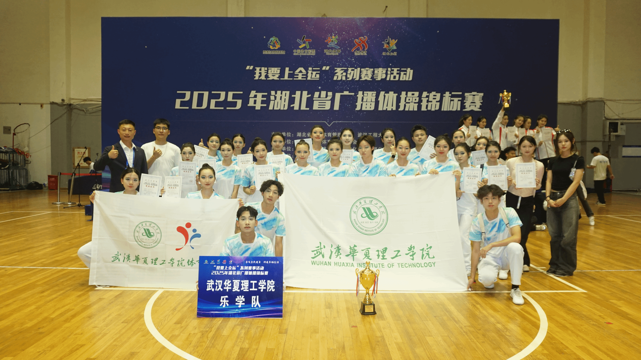 2025年5月17日,由湖北省社会体育管理中心主办的“我要上全运”系列赛事活动——2025年湖北省广播体操锦标赛在武汉工程大学流芳校区体育馆圆满落幕。beat365官方网站健美操队的同学们在赛前进行了为期一个月的赛前集中训练,精益求精,最终以高标准的动作完成度、富有感染力的表现征服了评委和观众。她们凭借出色表现,荣获大学组大集体项目一等奖,展现了华夏学子昂扬向上的精神风貌和扎实的体操功底。