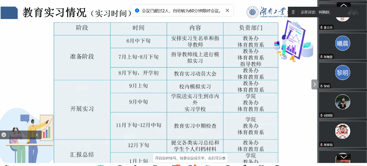 11月19日晚上20:00,华夏理工学院体育学院与湖南工业大学体育学院携手,通过线上平台成功举办了一场题为“新时代学校体育高质量发展:一流课程建设与体育专业发展”的专题讲座。本次讲座特别邀请了湖南工业大学体育学院教务办主任、博士生导师何艳群教授担任主讲嘉宾,体育学院副院长吴飞、休闲体育系主任甘文韬、体育教育系主任宁梦茹、实习实训中心主任付炜及各系专业教师参会。