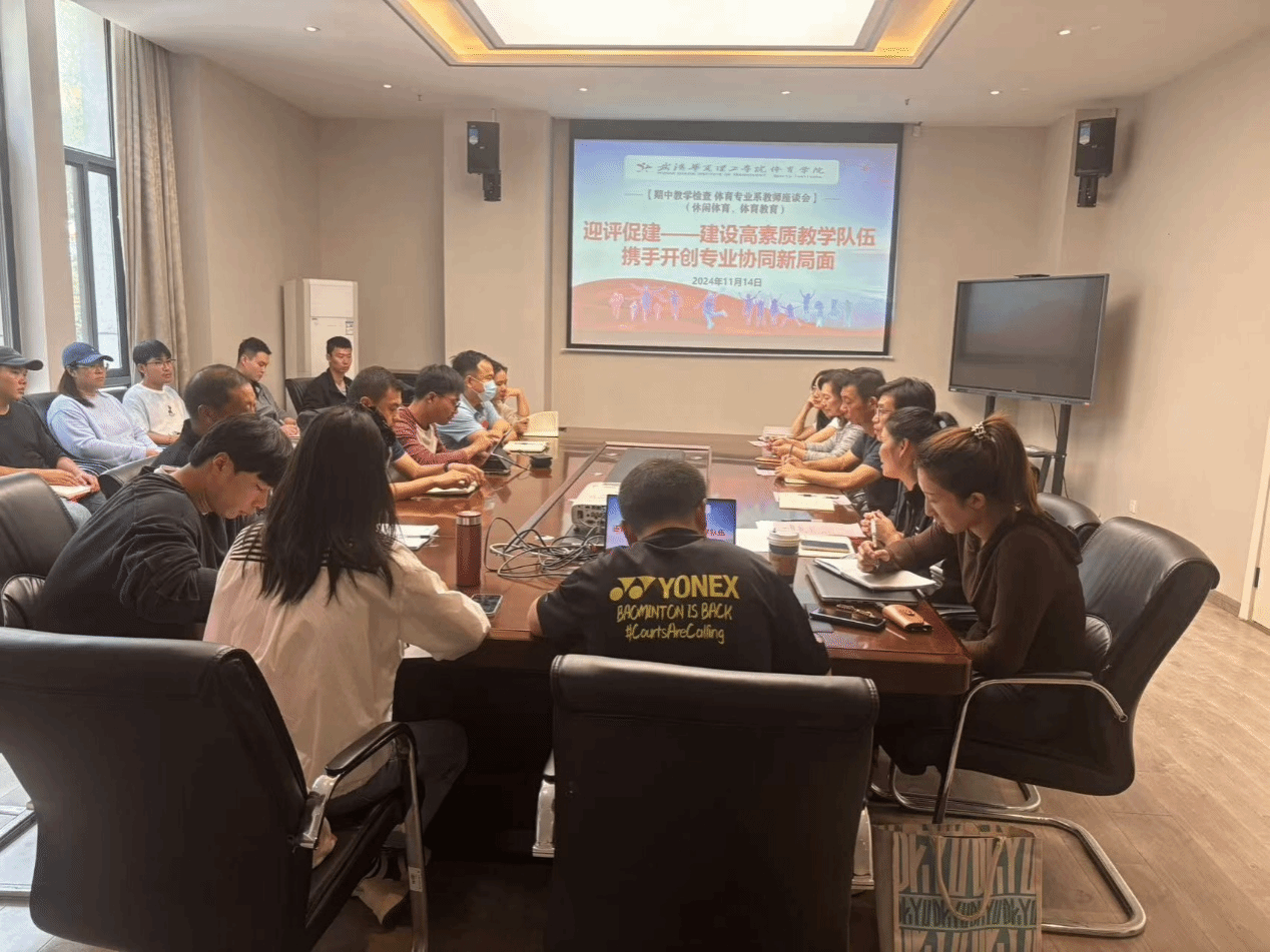 2024年11月14日中午12:30,体育学院期中教学检查——体育专业系教师座谈会在体育学院会议室召开。会议由体育学院副院长赵燕主持,校工会常务副主席梅燕,体育学院院长刘涛、党总支副书记毛峥毅、副院长赵燕、吴飞、教学行政主任肖青与体育专业全体教师参会。会议主要围绕本学期教学相关工作遇到的问题做出回顾与总结,并就本科教学质量评估相关工作推进作出相关部署。