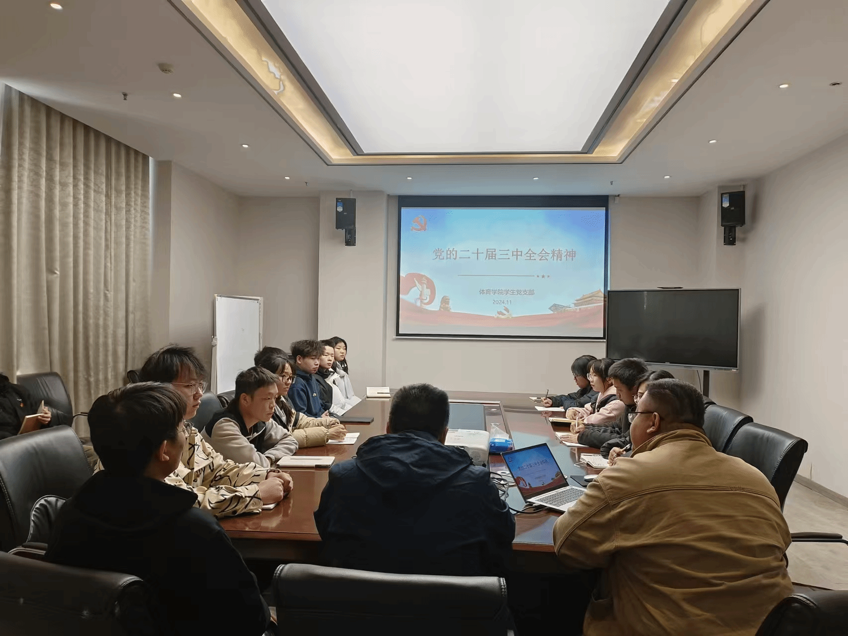 2024年11月27日中午12:30分,体育学院学生党支部于体育馆二楼会议室召开了学习党的二十届三中全会精神会议,参与本次会议的有:学工办主任陈世益、辅导员臧守相、叶航以及预备党员、新发展党员。本次会议旨在强化新发展党员、预备党员对党的最新方针政策的理解,提升其政治素养与责任意识。