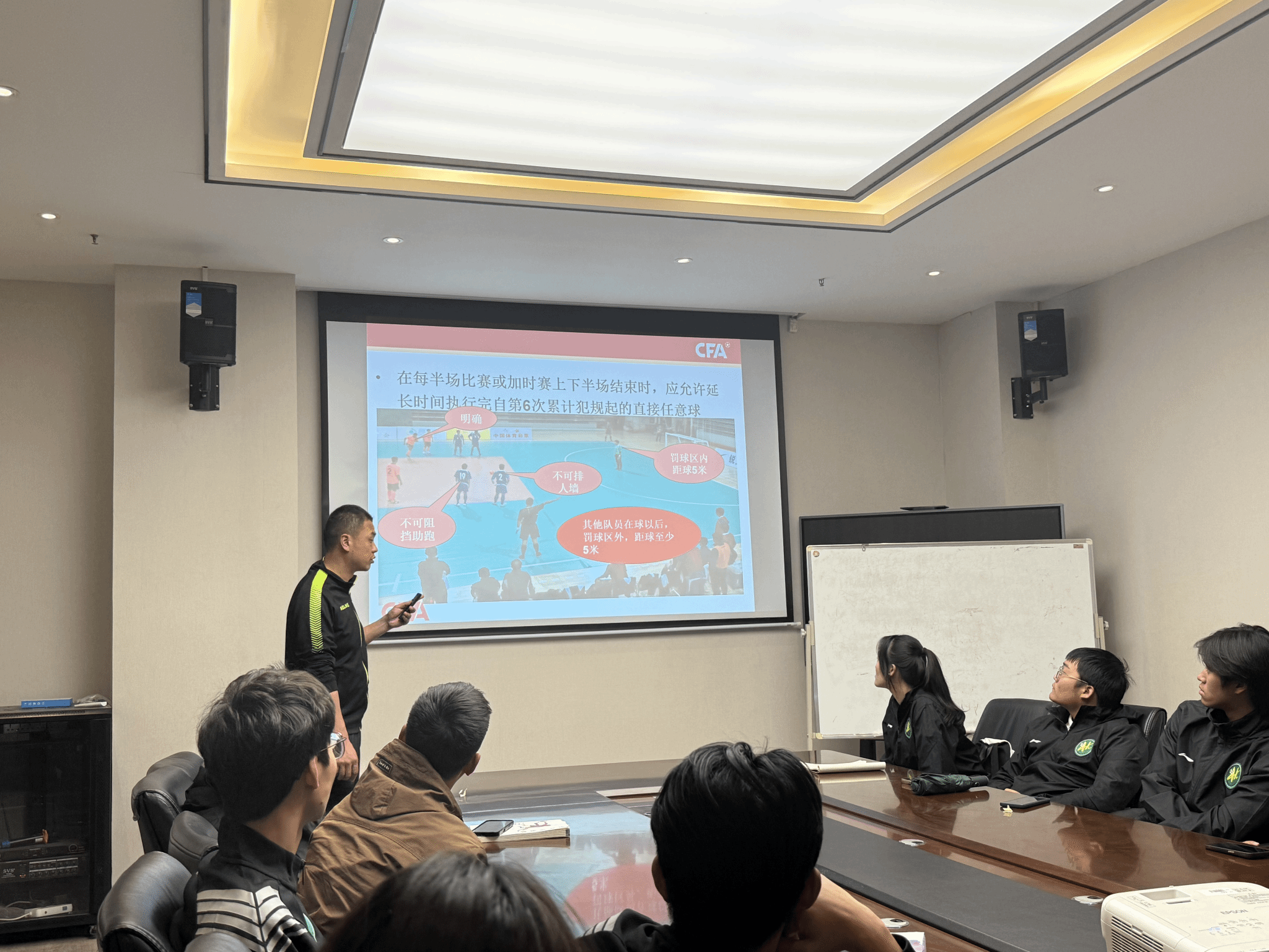 由王珺老师主持的裁判专项会议率先进行。王珺老师系统讲解了五人制足球赛的竞赛规则与裁判执裁标准,重点针对“禁区犯规尺度”“节次时限”“红黄牌累积规则”等易发生争议的环节进行案例推演。全体裁判员现场签署执裁承诺书,并针对判罚细节展开讨论。与会裁判代表表示,将秉持专业态度,为赛事公平公正提供坚实保障。