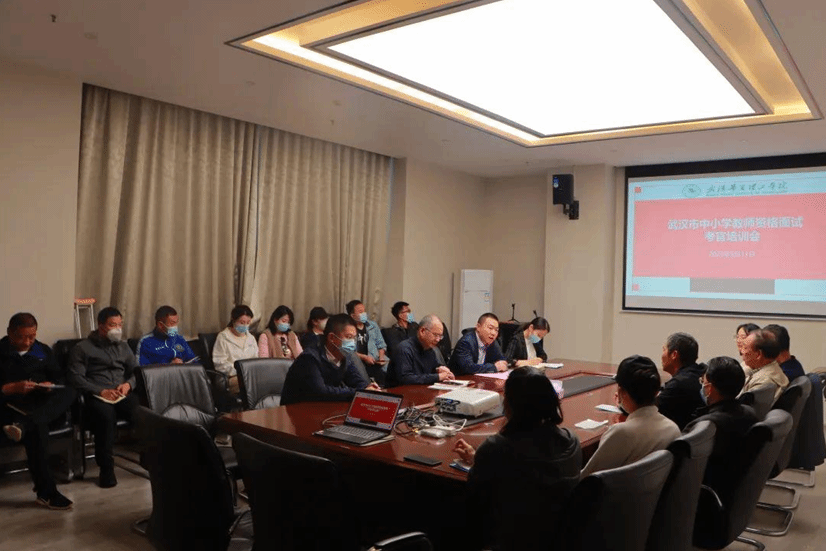 黄程讲到,学校高度重视首次承接教师资格(体育与健康)面试工作,专门 成立领导与纪检小组,严格筛选考官人选。为夯实基础、提升层次,体育学院组 建了由教育部和湖北省体育教学指导委员会专家领衔的考官团队,其中正教授共 六人(二级教授两人),得到了武汉市招考办的高度认可。同时,他对湖北地区 教师资格考试概况、教师资格面试环节的重要性、本次华夏学院考点整体情况做了相关说明。