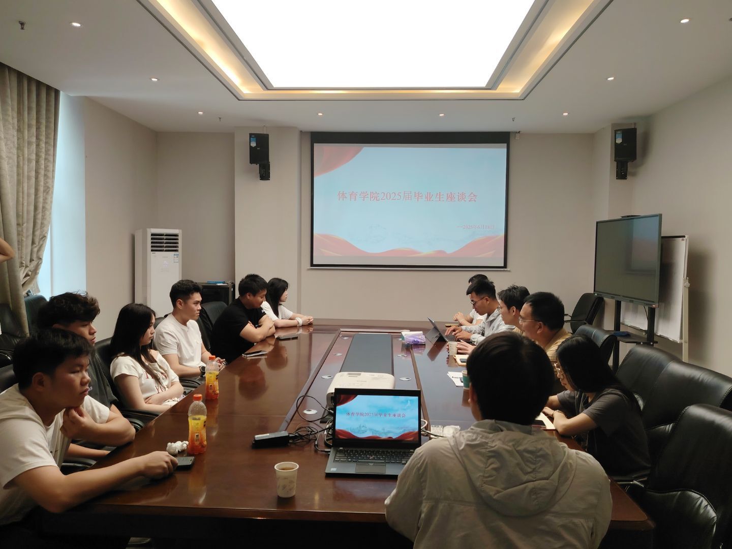 2025年6月18日上午10点,体育学院在体育馆二楼会议室隆重举行了2025届毕业生座谈会。体育学院党总支副书记毛峥毅、学工办主任陈世益、辅导员叶航以及毕业生代表们齐聚一堂,共同回顾校园时光,展望未来发展。