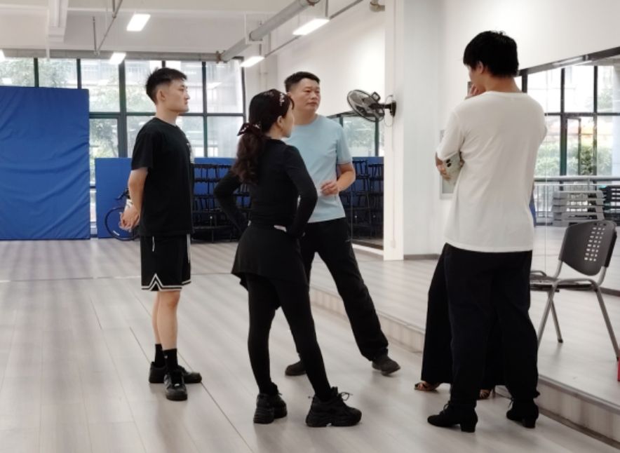 周末集训转向整体编排与舞台模拟。古雅辰老师根据队员特长调整队形,反复打磨队形变换时的衔接细节,避免出现混乱;彭文耀老师则细化上场动线、舞台中心定位与下场衔接流程,还特别提醒队员注意表情管理,展现拉丁舞的活力。