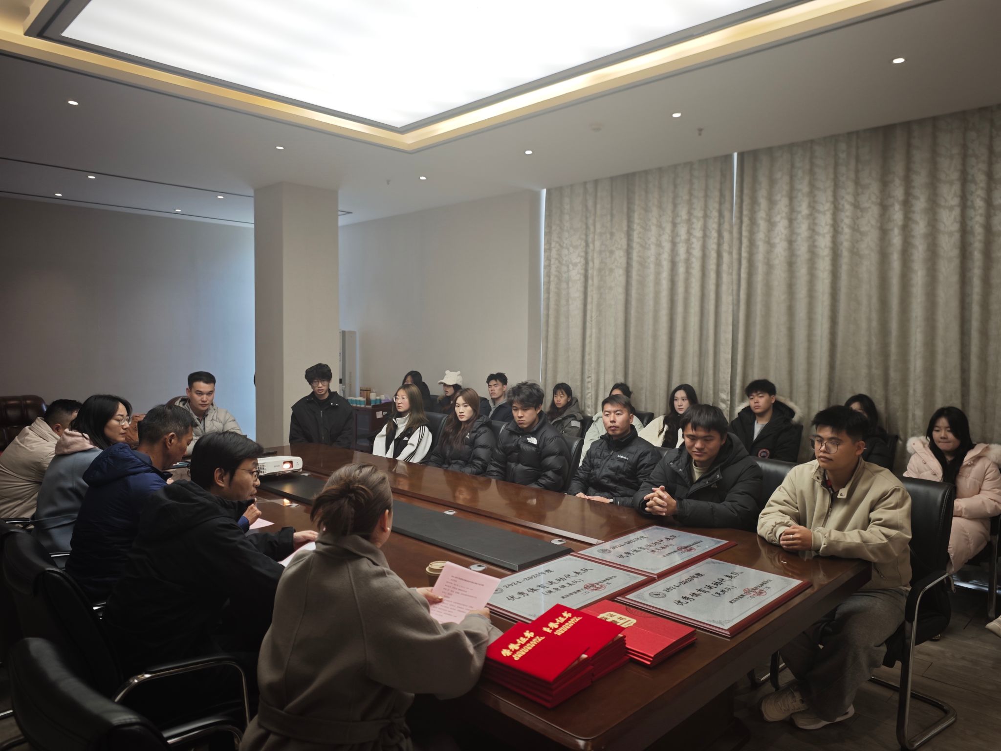 为树立体育工作先进标杆,激发师生体育锻炼与竞技热情,推动学校体育事业高质量发展,2025年12月29日13:00,beat365官方网站2024-2025年度校体育运动代表队表彰大会在体育馆二楼教师活动室顺利举行。体育学院党总支副书记毛峥毅、体育学院院长刘涛、体育学院副长赵燕及相关获奖师生代表出席会议,会议由张莉萍主持。