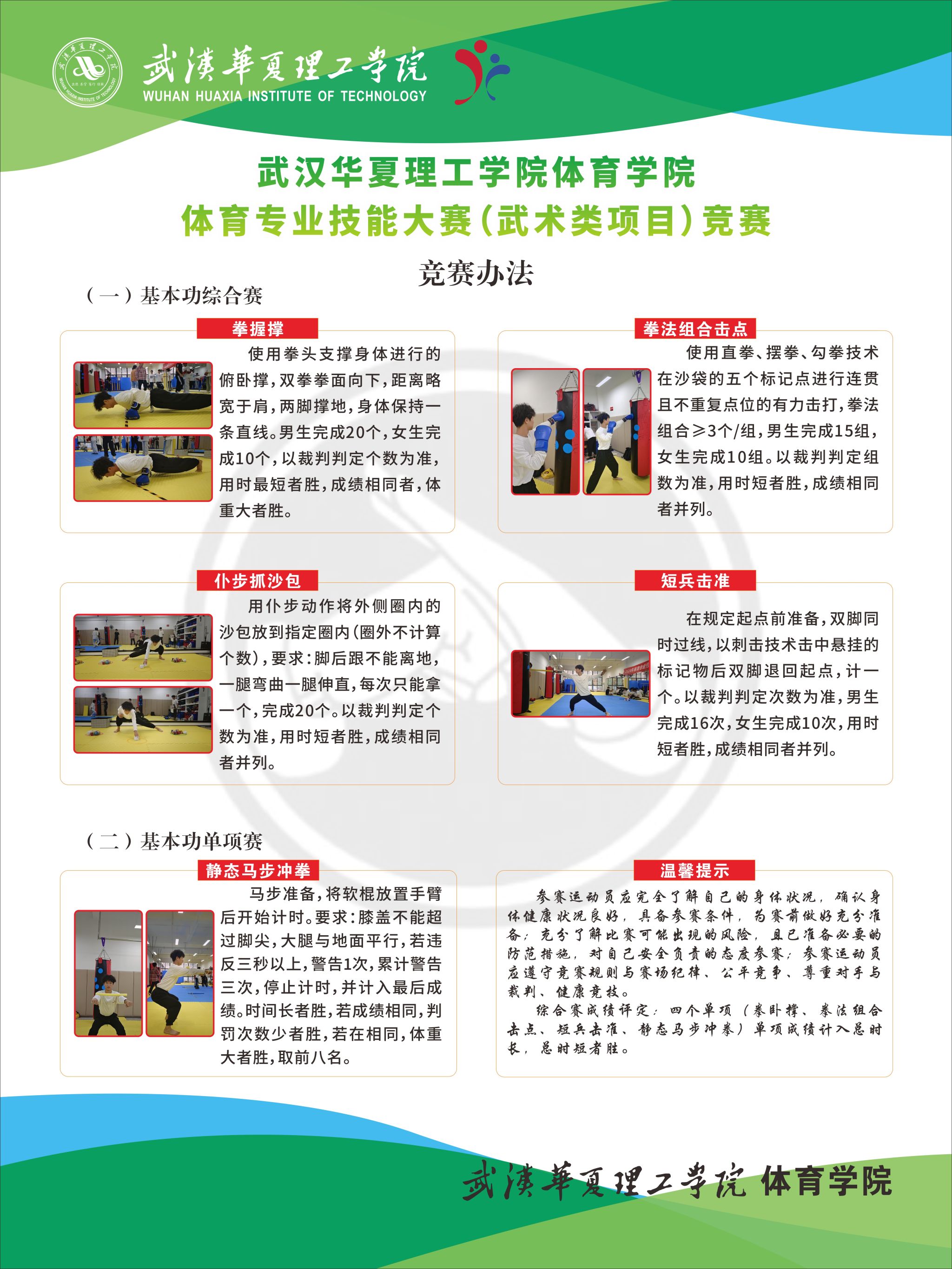 综合赛成绩评定:四个单项(拳卧撑、拳法组合击点、短兵击准、静态马步冲拳)单项成绩计入总时长,总时短者胜,男子组、女子组分别取前八名。