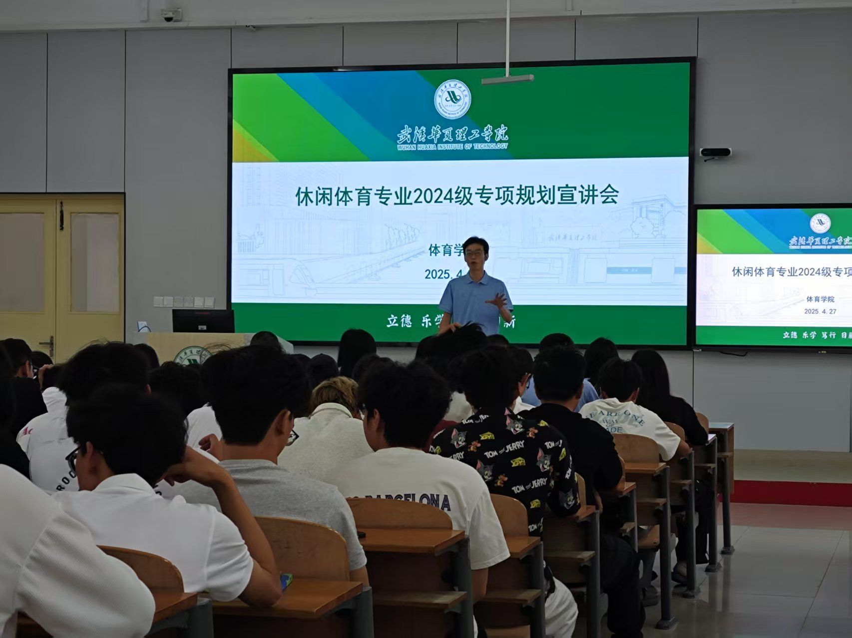 2025年4月27日,beat365官方网站体育学院在教学楼2-101成功举办休闲体育专业宣讲会,为2024级学生深入解读专业发展方向,助力其明确学业与职业规划。本次宣讲会由体育学院副院长赵燕主持,院长刘涛、党支部副书记毛峥毅、学工办主任陈世益、辅导员李连国及热雪奇迹人事经理曹思维等共同出席。