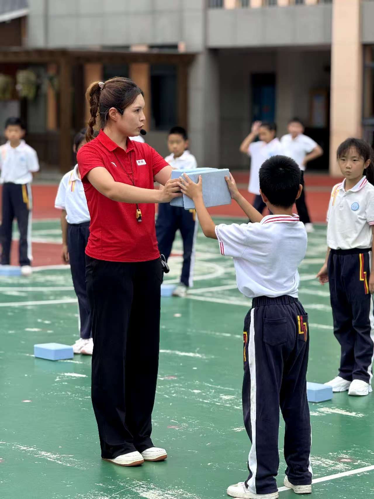 崔婷婷老师执教水平一(二年级)《平衡:多种姿势的平衡及趣味课课练》,将瑜伽砖引入体操类教学,通过“魔法造型秀”“抢夺魔法石”等趣味游戏环节,让学生在多种姿势平衡练习中理解“身体重心稳定”的核心知识点。课课练环节与主教材有机融合,不仅强化了学生的平衡能力,更培养了他们在运动中遵守规则、挑战自我的体育品德。