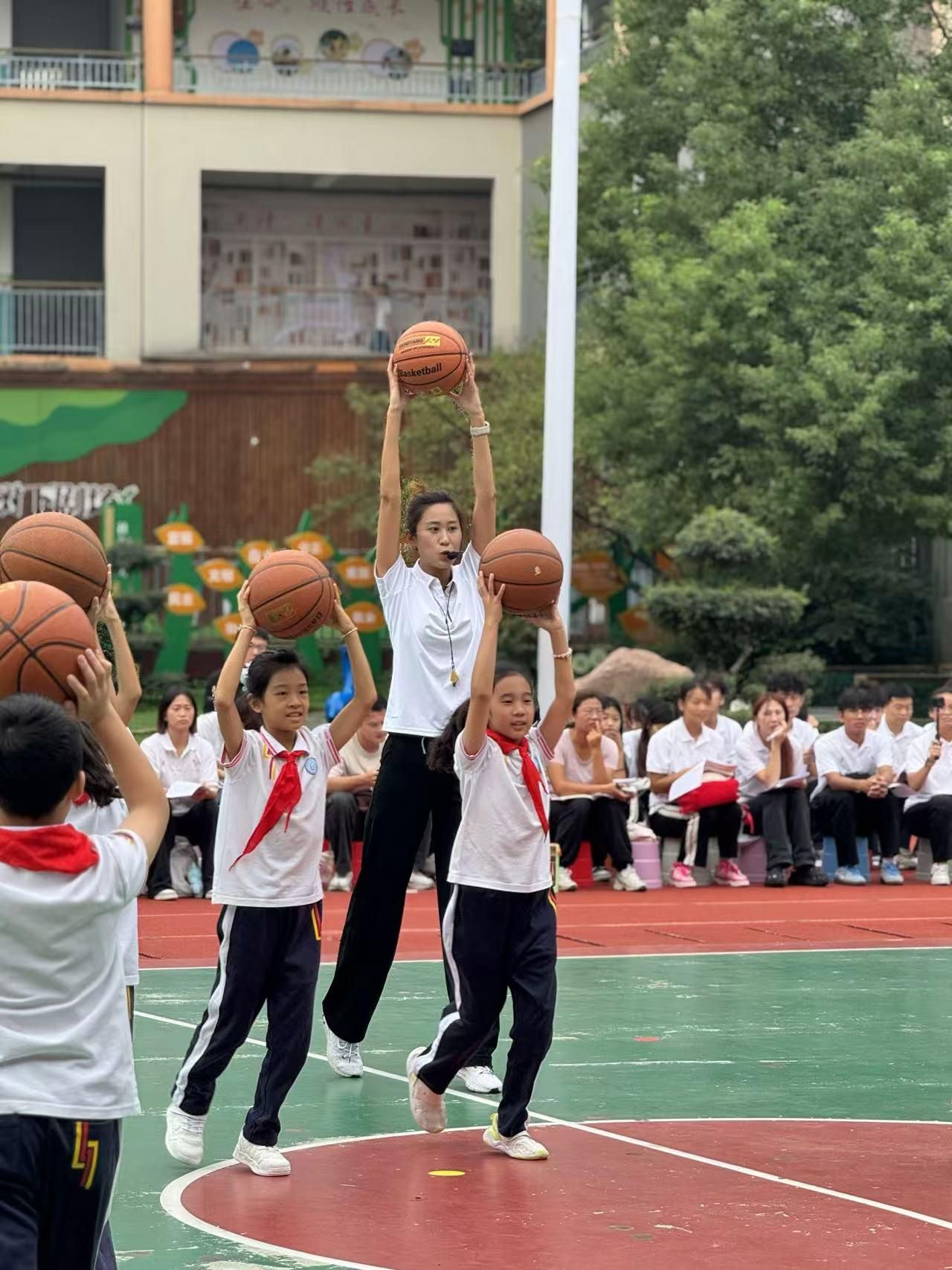 梁尹老师执教水平一(二年级)《操控性技能:运球及趣味课课练》篮球教学。课程以40个篮球为核心器材,引导学生掌握“五指自然张开,掌心空出”的运球动作要领,并通过单一运球练习与趣味折返跑竞赛相结合的方式,体现小单元教学的梯度性,让学生在“学中练、练中赛”的过程中,逐步提升控球水平,增强团队协作意识,实现核心素养在球类项目中的具象化落实。