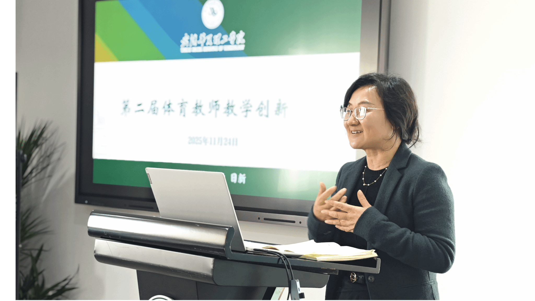 副校长李猜在讲话中明确了体育教学创新的核心方向,她指出,教学创新需聚焦“技术融合、精准育人、实效导向”三大关键点,并提出三点具体建议:一是强化材料规范性,确保教案、授课日历与教学视频逻辑一致,深度挖掘教学数据,以数据支撑教学实效;二是优化说课的结构化,突出“创新点-实施路径-育人成效”的关联性,让创新成果可感知、可推广;三是深化学情精准化,立足学生能力差异与发展需求,推进分层教学与个性化指导,切实提升学生课堂参与感与获得感。