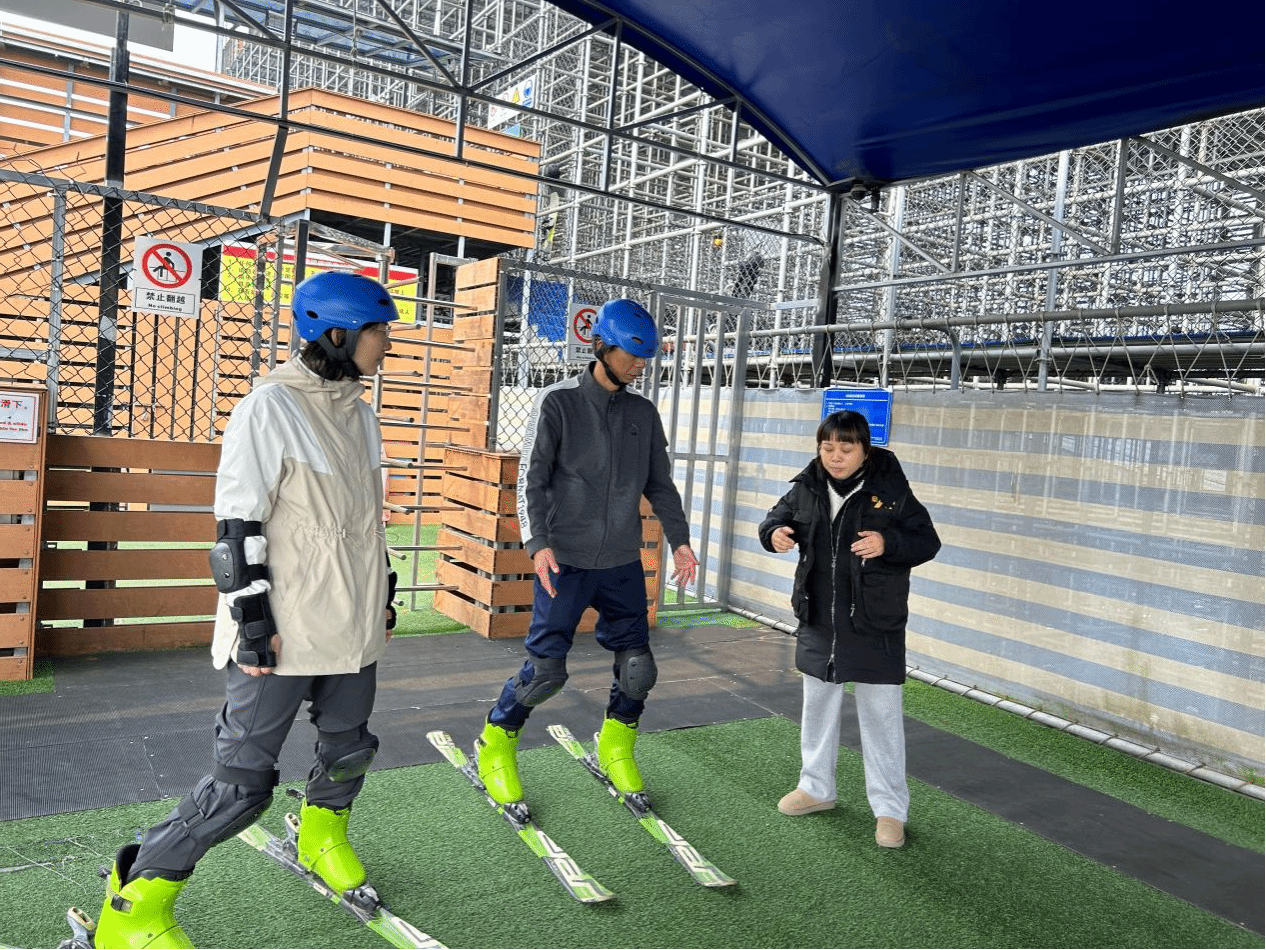 为直观感受旱雪场地的滑行体验与设施实用性,刘涛院长一行在工作人员的指导下进行了实地体验,亲身感受了“金针菇”旱雪毯的滑行质感、雪道坡度设计及安全缓冲效果,详细记录了不同雪道对教学训练的适配性特点,为梧桐湖校区滑雪场地后续的雪道设计及教学场景优化积累了宝贵的经验