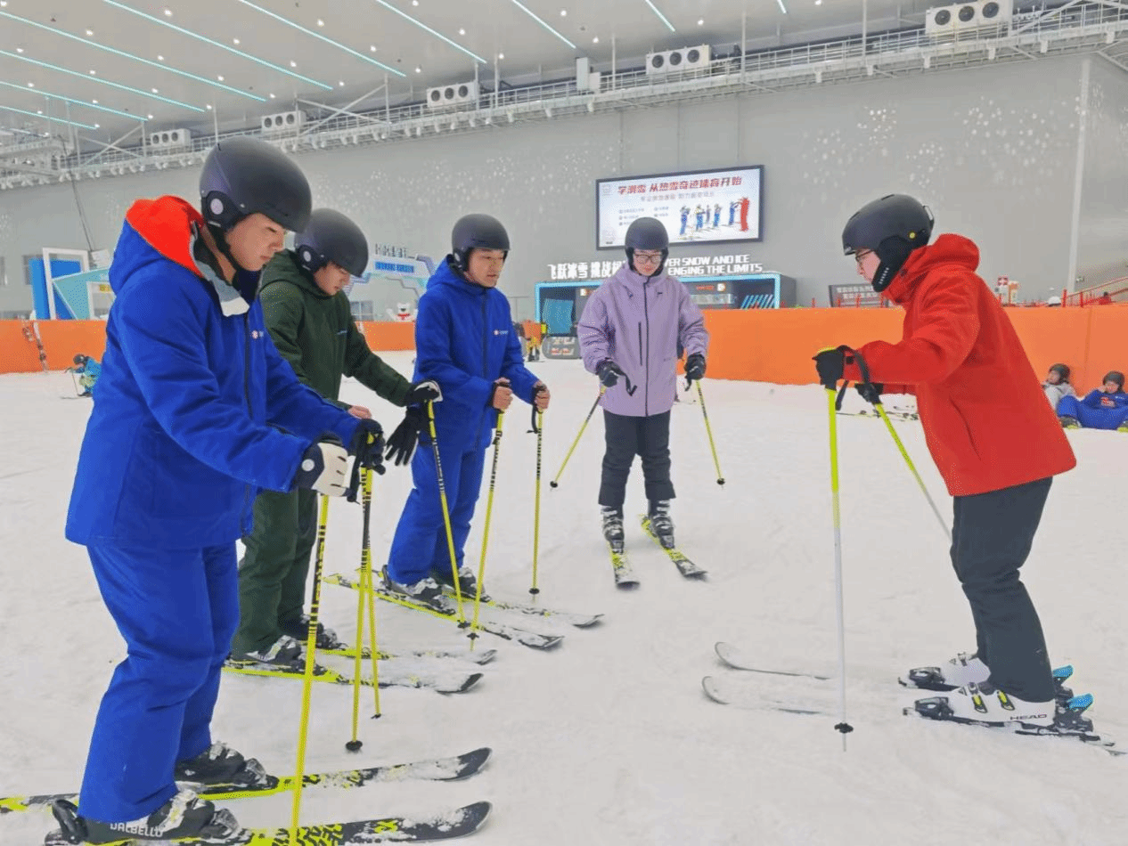 随后,张昊臻同学带领大家进行了试滑。在试滑过程中,张昊臻同学分享了自己滑行的相关技巧,包括动作要领、平衡控制等内容,同学们认真聆听,并在实践中积极尝试和调整,努力掌握关键的滑雪技能。