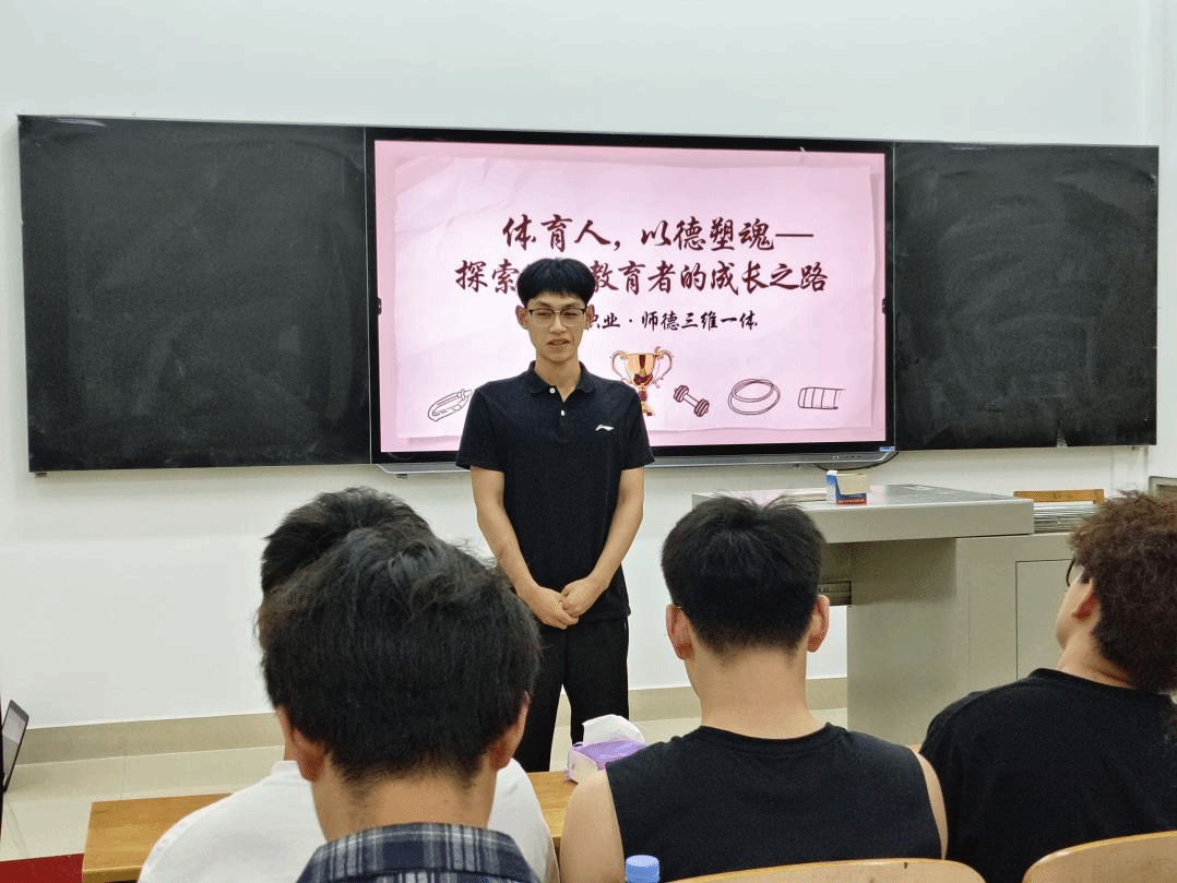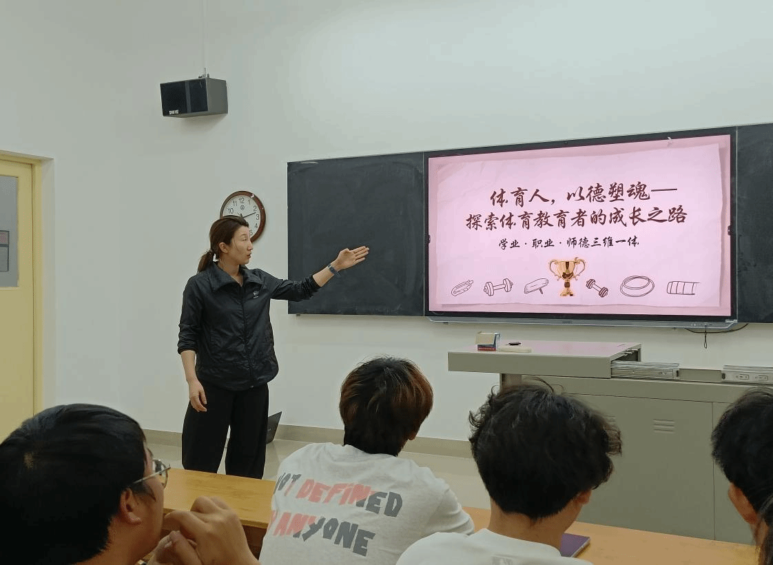 4月23日下午17:40,体教1234班导师班主任宁梦茹老师组织召开“以体育人,以德塑魂——探索体育教育者的成长之路”主要围绕学业、职业、师德三维赋能计划展开 ,主题班会上,宁梦茹老师借助PPT,生动展现了优秀体育教育者在课堂教学、运动训练以及品德培养等多方面的精彩瞬间,从而自然引出本次班会的主题。