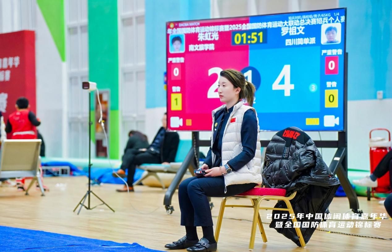 2025年12月6-7日,“2025年中国休闲体育嘉年华暨全国国防体育运动大联动总决赛”在江苏省江阴市飞马体育公园举办。我院体育教育系主任宁梦茹加入裁判阵容,出任“短兵对抗”项目裁判员,同时开展体育项目及赛事调研工作。
