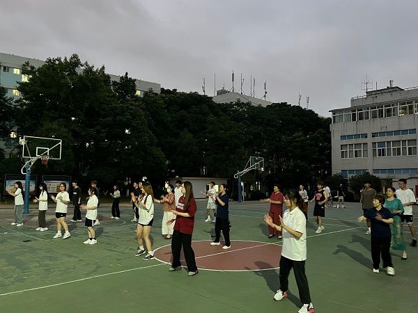 活动中,体院学子有序的跳起了广场舞,伴随着欢快的节拍,踏着轻快的脚步,时而左时而右、时而分散时而聚合,变换着各式各样的队列,展现出了体院学生饱满的热情和良好的精神风貌,也吸引了楼管阿姨和食堂阿姨前来跳广场舞。周围的同学也逐渐跟着音乐一起律动起来,篮球场上洋溢着欢声笑语,大家都感受到了广场舞所带来的轻松与快乐,许多同学拿出手机记录下了这欢快的一幕。