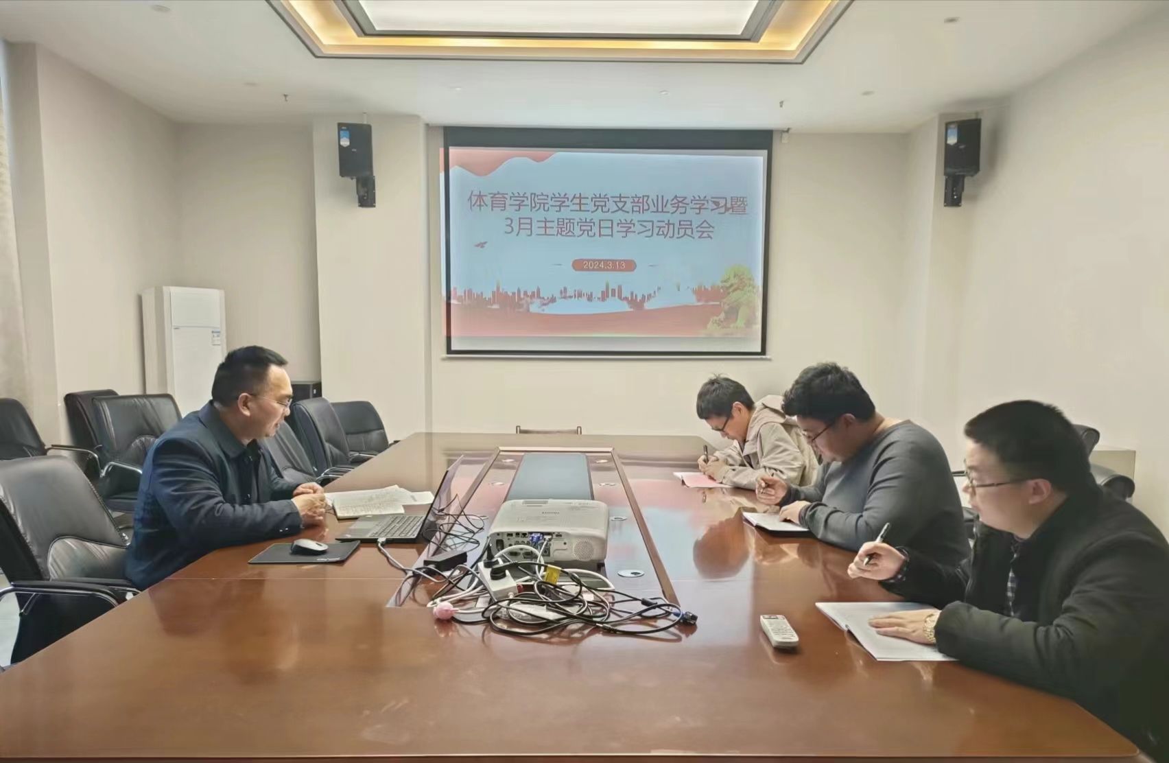 2024年3月13日16:00,我院休闲体育学生党支部在体育馆二楼会议室召开了业务学习暨3月主题党日学习动员会。本次会议由学生党支部书记陈世益主持,支部组织委员臧守相、宣传委员陈戬、纪检委员李连国参加了本次会议。