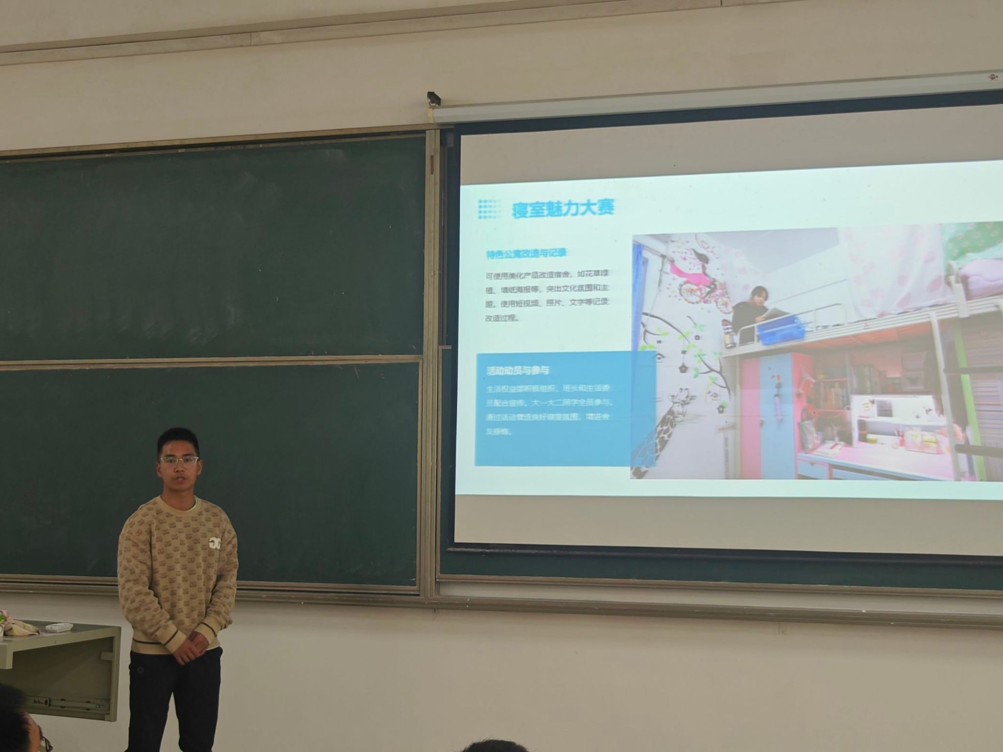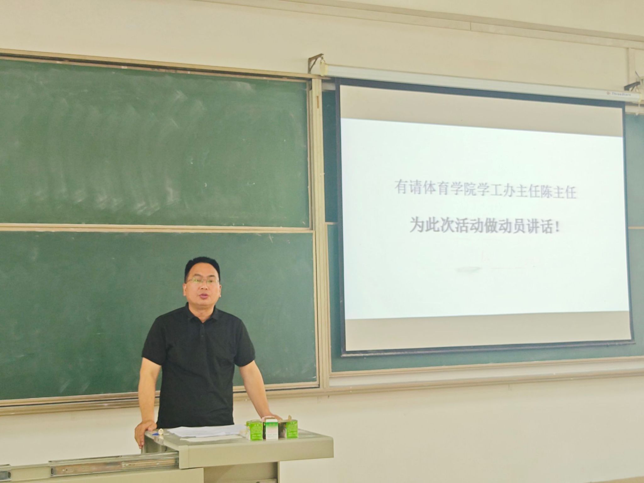 为进一步推进我院宿舍文化建设,丰富学生宿舍文化生活,共同营造健康向上、青春和谐、文化氛围浓郁的宿舍生活环境,2024年4月15日中午12:20分,我院在教学楼3-101开展了“公寓文化节动员会”。参与本次会议的人员有:体育学院学工办主任陈世益、团总支书记李连国、副书记陈戬、活动指导老师臧守相、生活权益部的相关人员以及各班生活委员、寝室长。