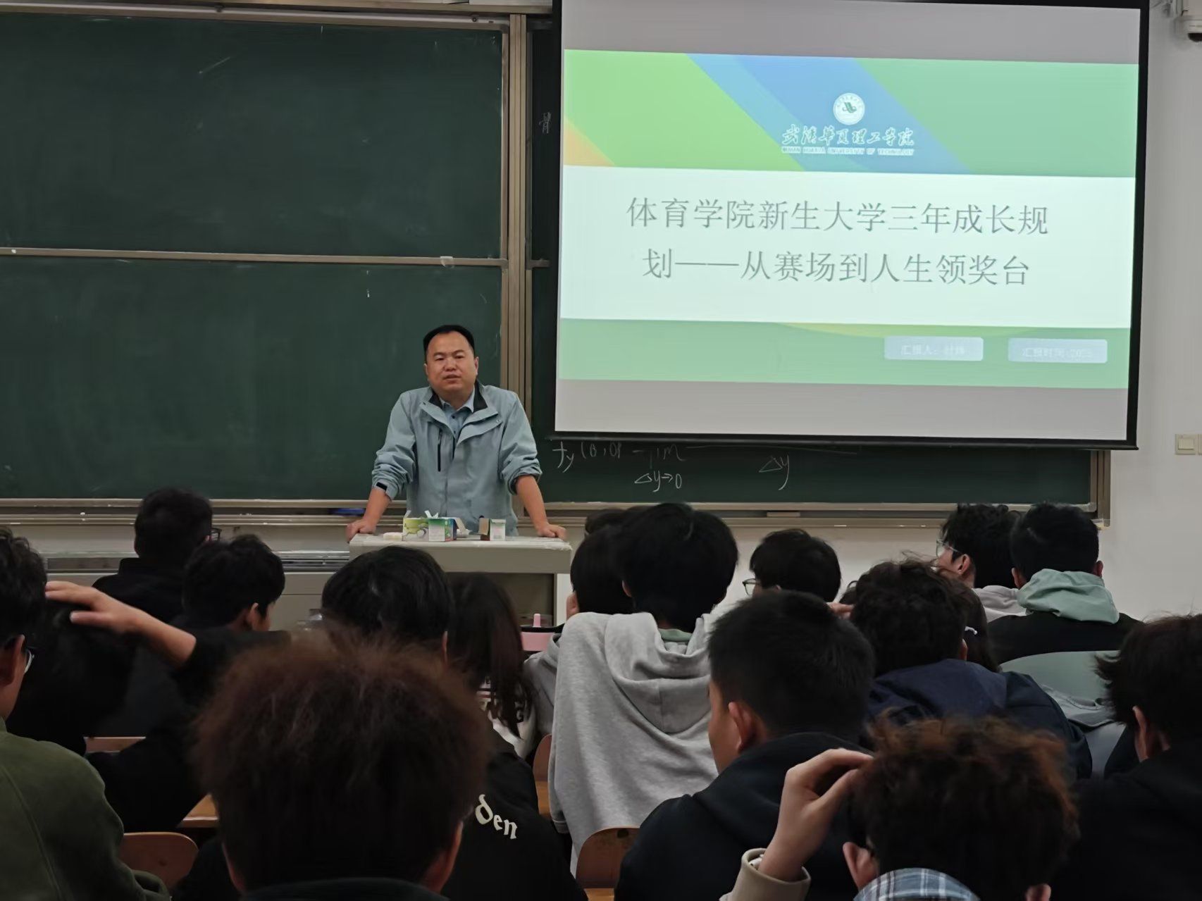 2025年3月27日,休闲体育24级1班在教学楼1-306教室召开了一场别开生面的主题班会——“从赛场到人生领奖台”。导师班主任付炜老师带领全班同学共同探讨大学三年成长规划,通过六大板块的深度讲解与互动环节,为同学们的未来发展注入信心与方向。