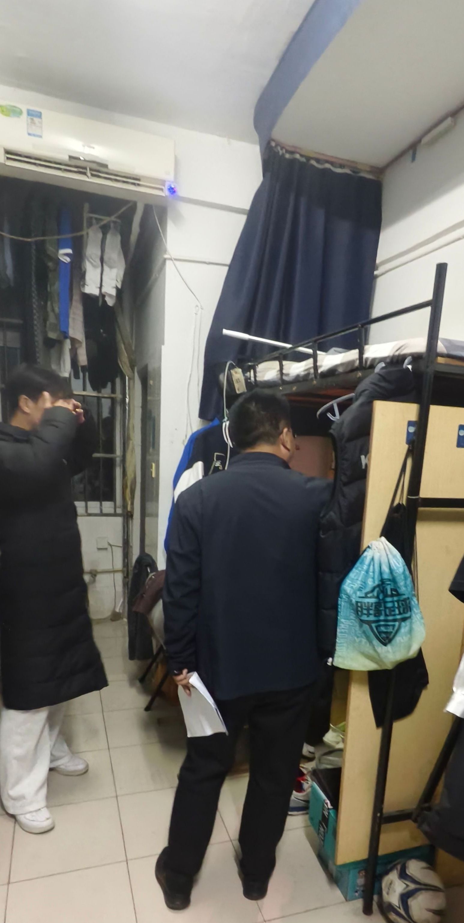 从检查现场照片可见,检查组细致查看寝室各个角落,陈世益主任针对发现的用电不规范、物品堆放杂乱等问题,当场向学生讲解潜在安全风险,督促即刻整改。此次检查共发现多起违规使用烧水壶的情况,检查组均按规定处理,并要求相关寝室限期完成整改。