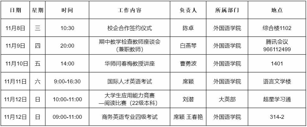 外国语学院第十周会议及活动安排表