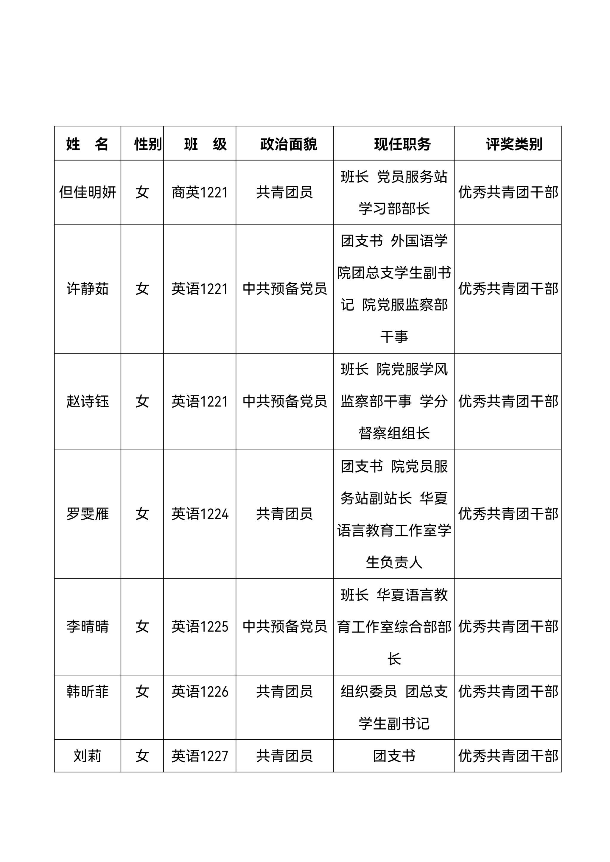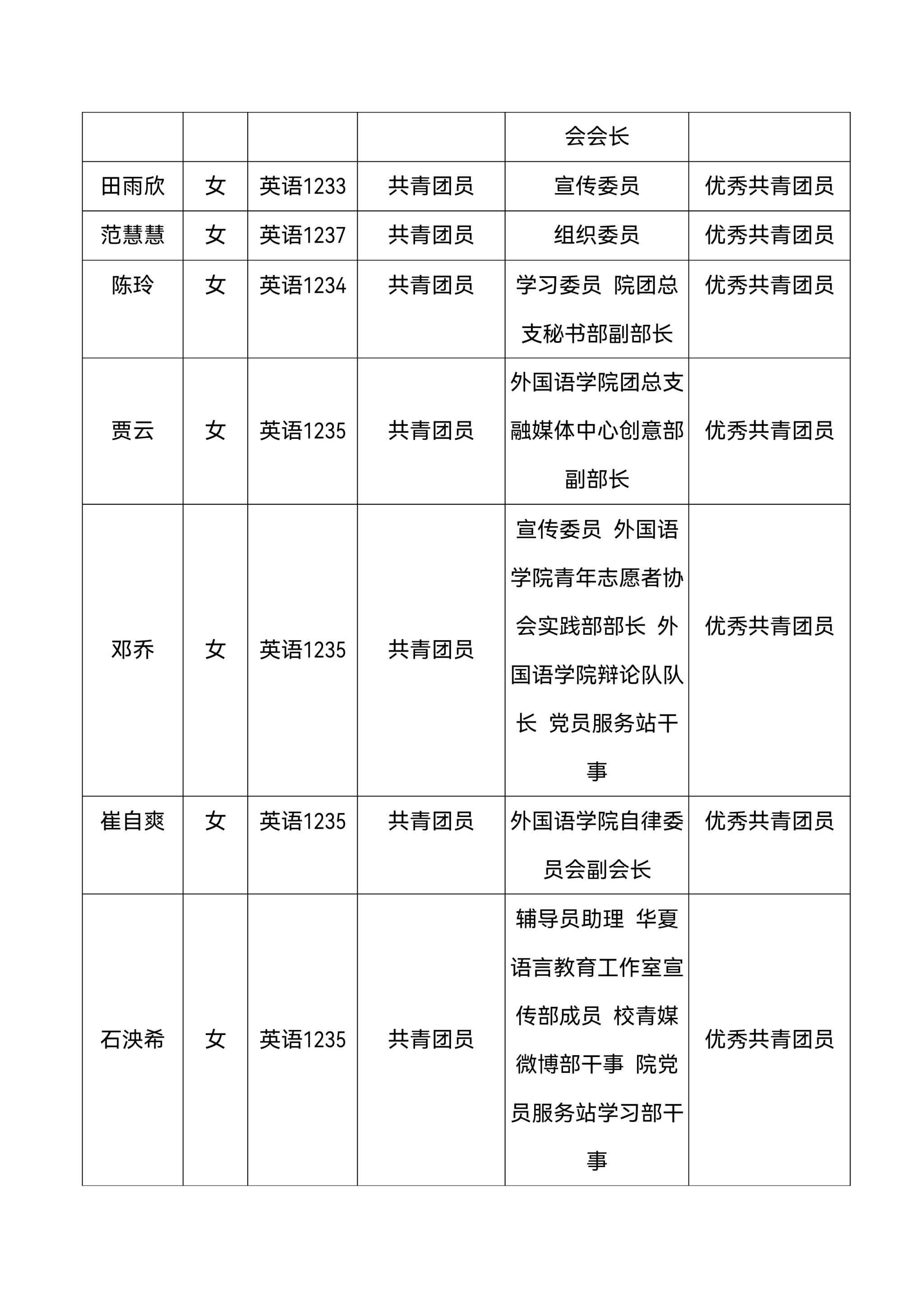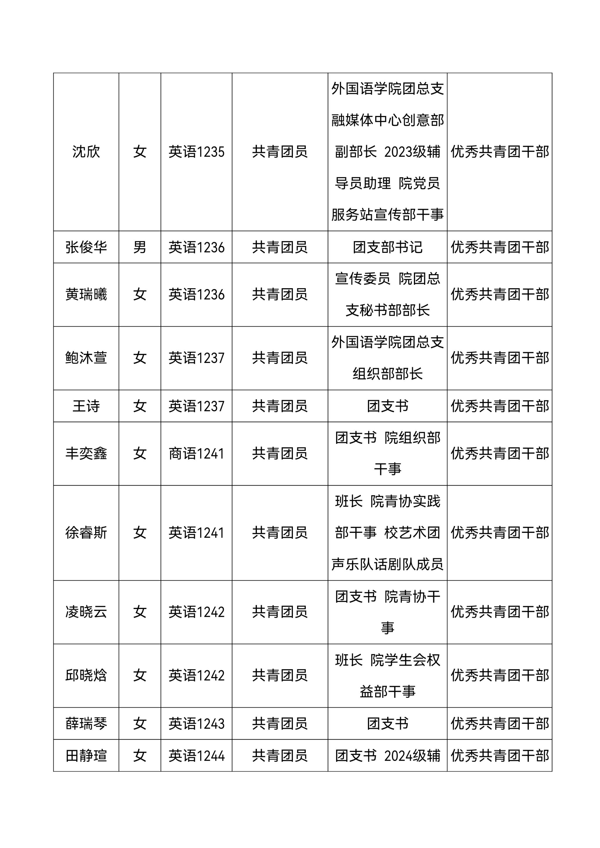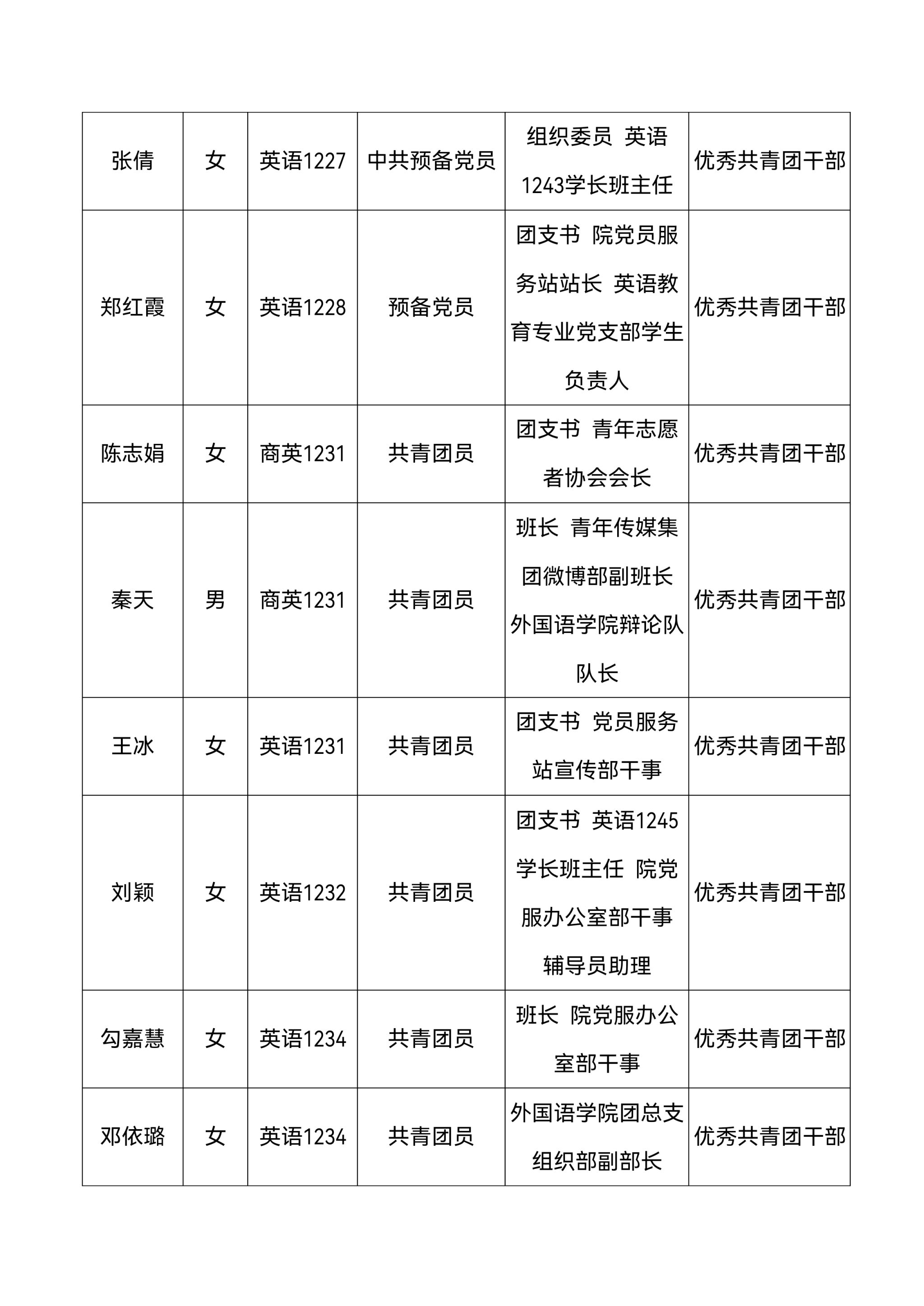 按照学校团委工作安排,结合我院团建工作整体情况,外国语学院进行了共青团先进个人评选工作,现将名单公示如下: