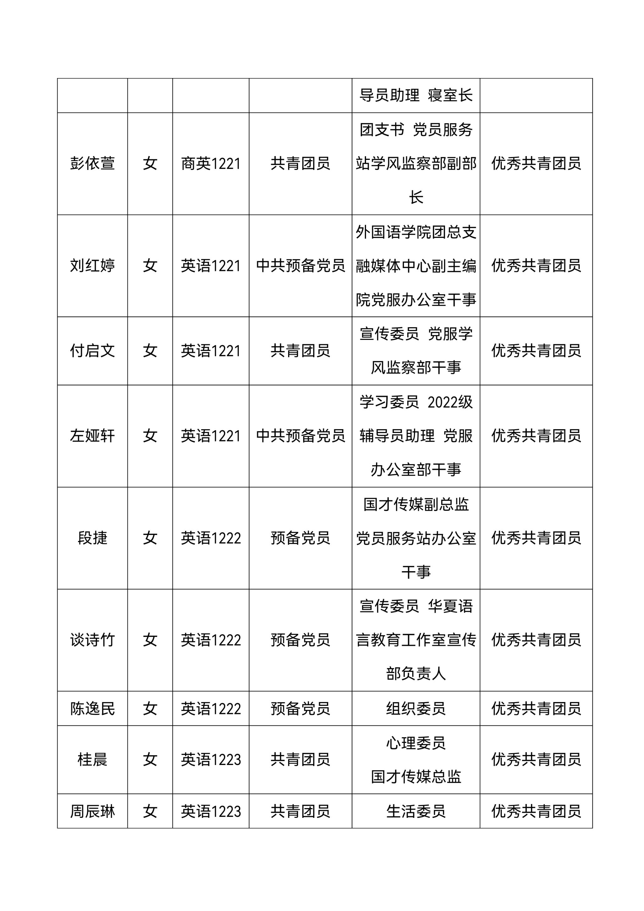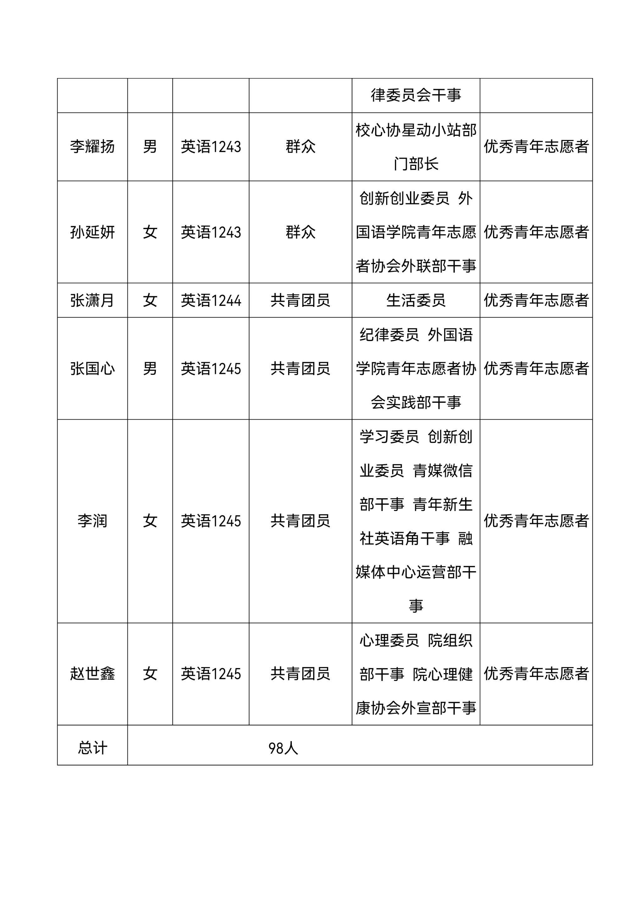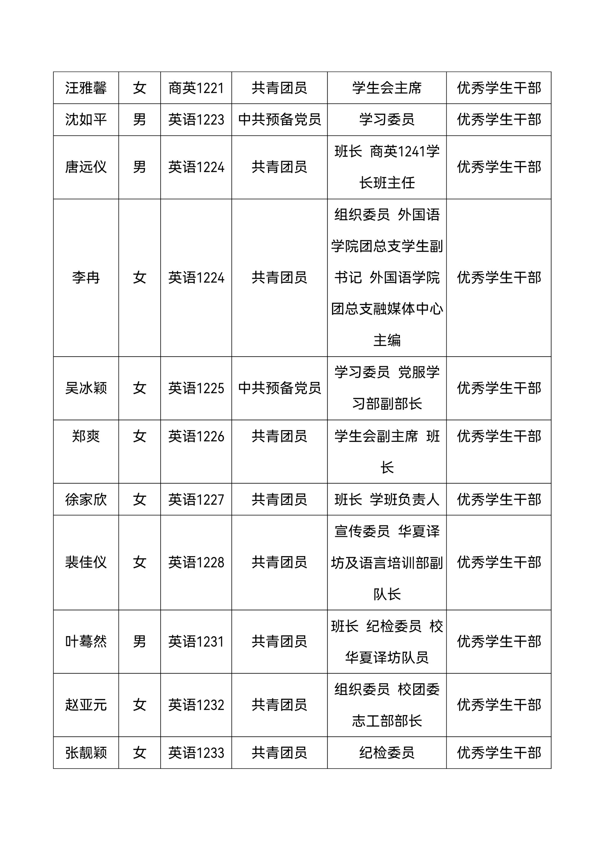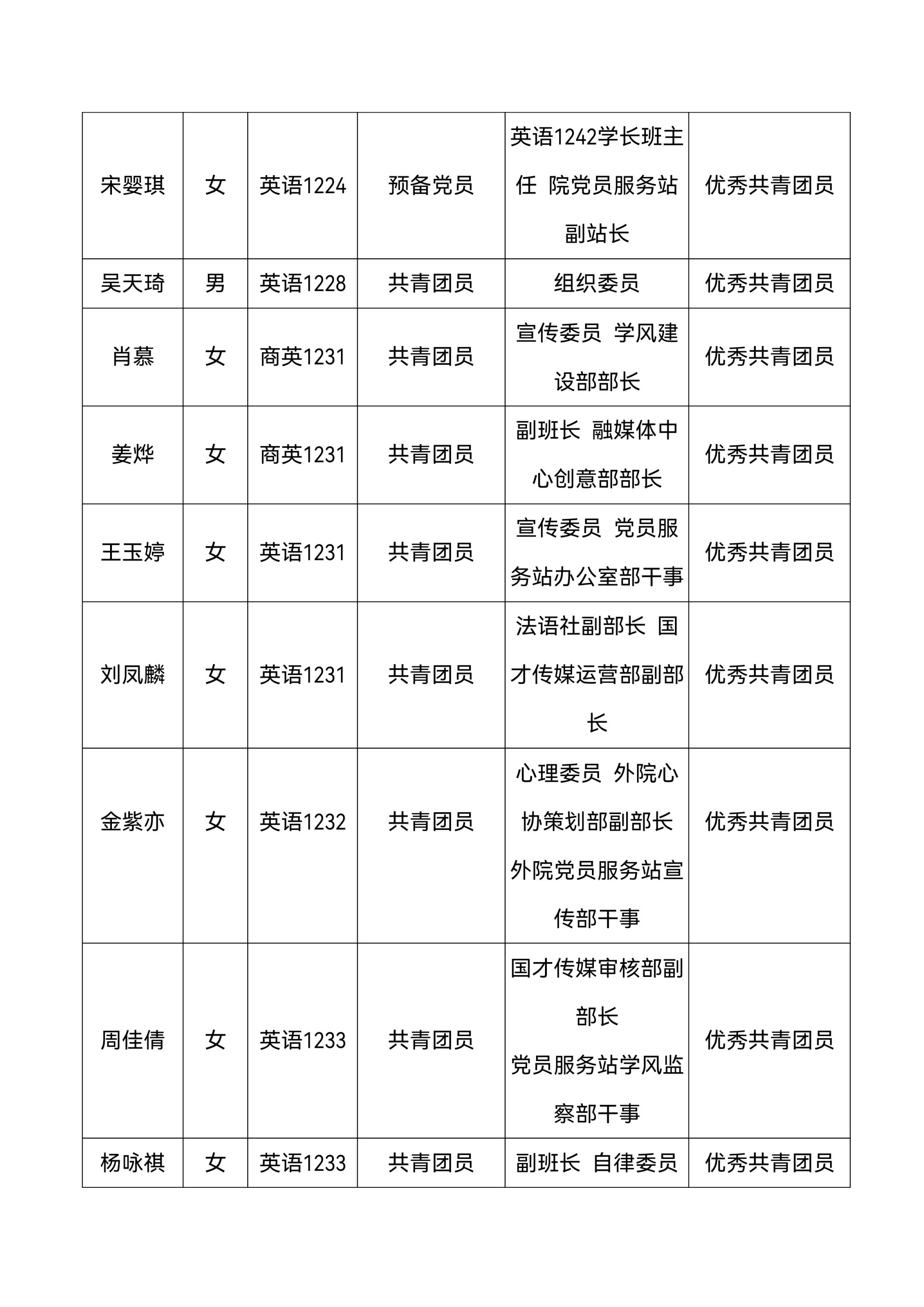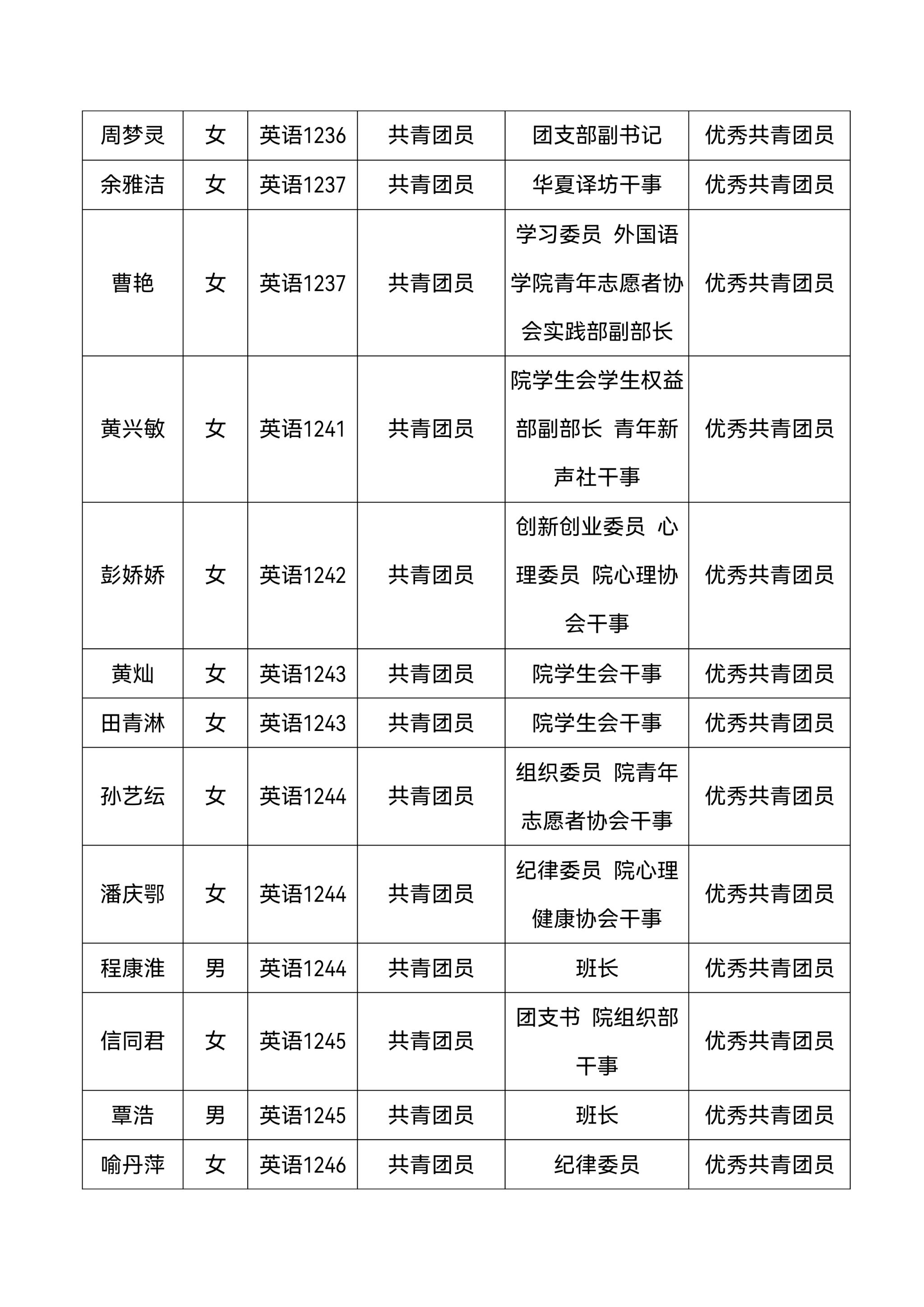 按照学校团委工作安排,结合我院团建工作整体情况,外国语学院进行了共青团先进个人评选工作,现将名单公示如下:
