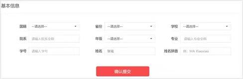 成功登录、确认参赛协议后,选手需填写国籍、省份、学校、院系、年级、专业、学号、姓名等基本信息。