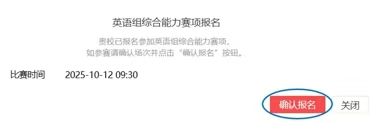 选手填完基本信息后,请点击相应比赛报名按钮,进入报名弹窗,点击“确认报名”,方视为报名成功。下面以英语组综合能力赛项为例,展示报名流程。