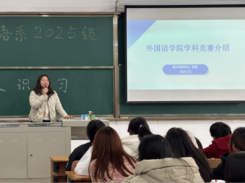 国才培训中心的刘潇老师则为同学们介绍了外语学科竞赛的相关内容,包括各类竞赛的参赛条件、备赛技巧以及竞赛对专业能力提升和职业发展的积极作用,为同学们搭建起专业学习与实践应用的桥梁。
