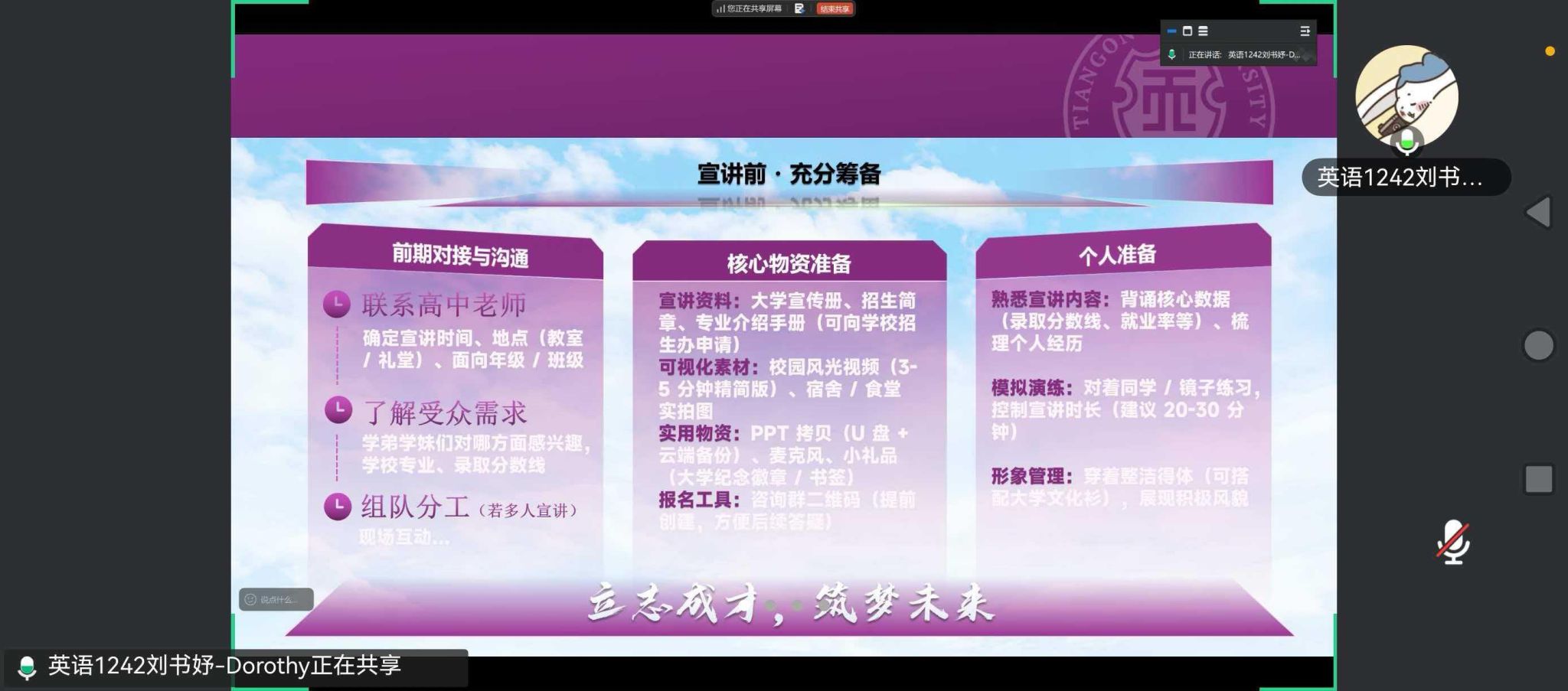 培训伊始,龚飞老师向同学们介绍了本次培训会的主讲人——英语1242班的刘书妤学姐。刘书妤学姐不仅在专业学习上成绩优异,更有着丰富的返校宣讲经验。