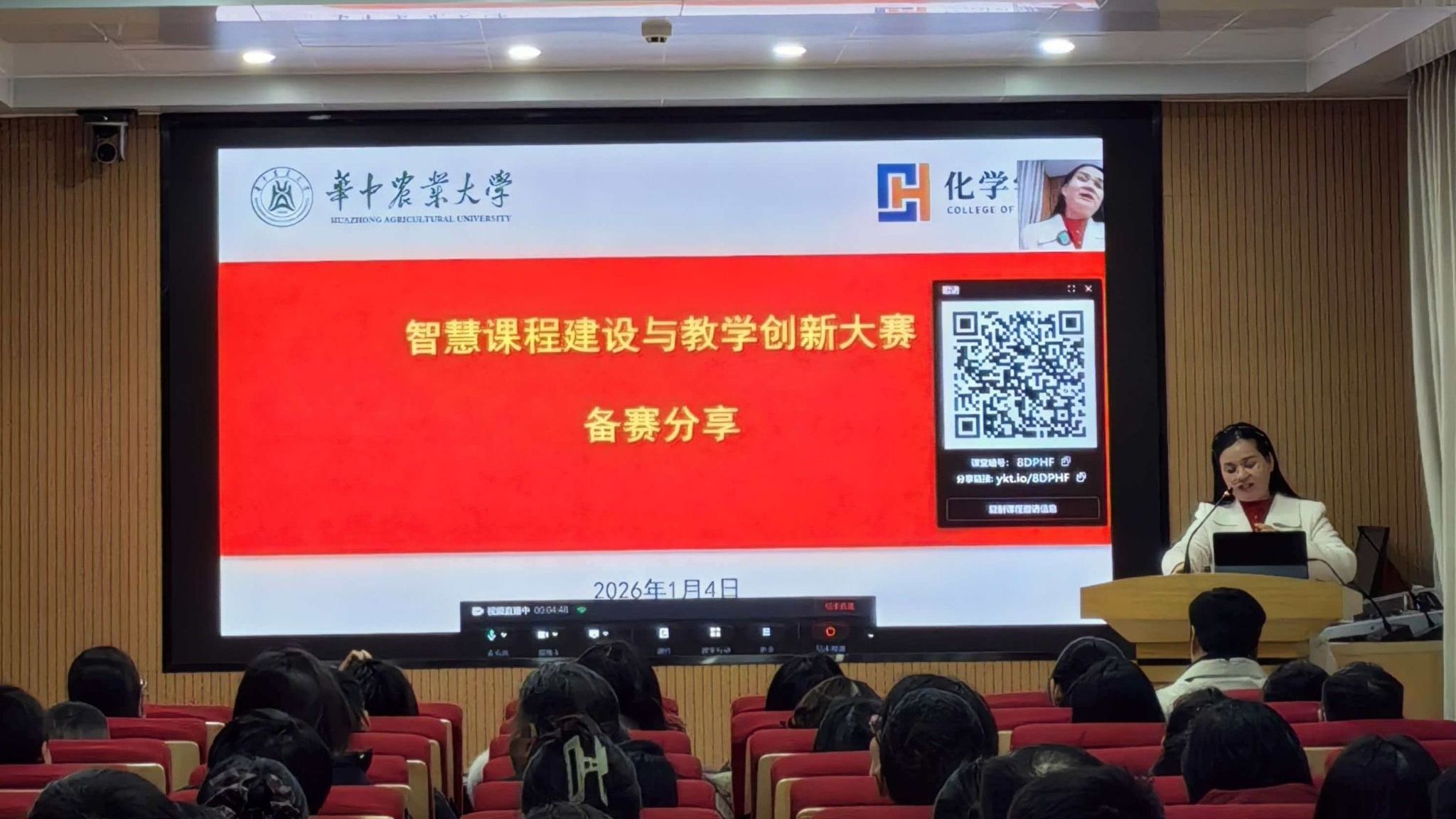 2026年1月4日下午,外国语学院大英部老师参加了在华中农业大学举办的“智慧课程建设与教学创新大赛备赛”分享会。本次活动旨在为教师搭建教学创新交流平台,助力教师精准把握教学创新大赛赛事要点,提升智慧课程建设与教学创新能力。