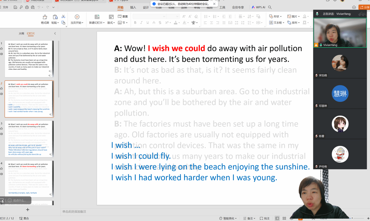 接下来,杨主任带领大家深入剖析了“环境污染控制”主题教学。内容上,系统梳理了污染类型、成因及相关核心词汇与句型,如“do away with”,情态助动词等,引导学生掌握用英语探讨环境议题的表达方式。