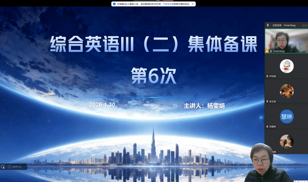 2026年1月30日上午,英语系于腾讯会议线上平台召开《综合英语III(二)》课程第六次集体备课会议。本次会议由英语系杨雯娟副教授主持,参会人员有英语系邓慧琳、宋文君、宋怡晓、尹伶俐老师和商务英语系陈蕾老师,大家共同围绕《综合英语III(二)》课程继续进行教学内容剖析和教学方法研讨。
