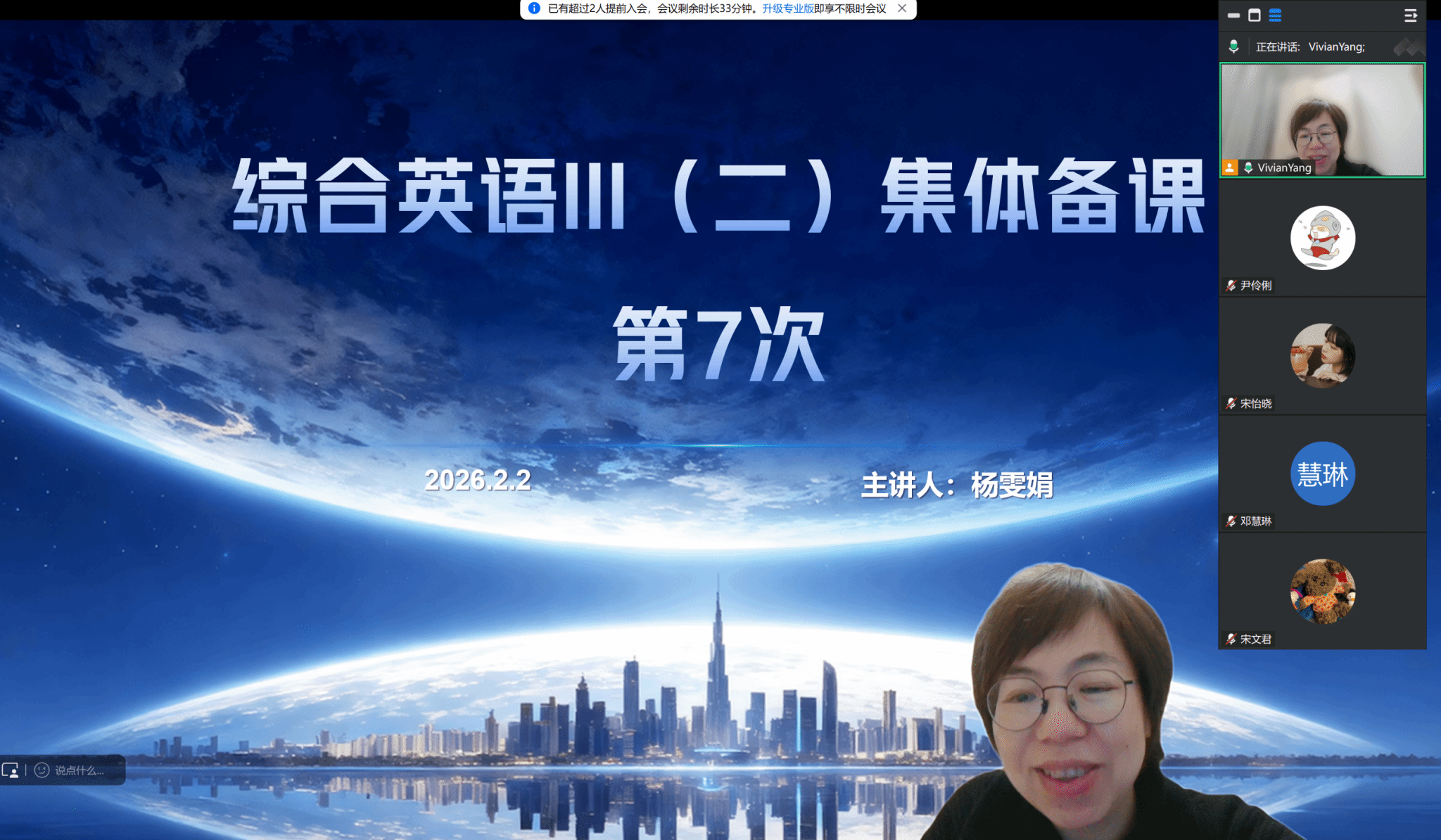 2026年2月2日晚上19:00,英语系于腾讯会议线上平台召开《综合英语III(二)》课程第七次集体备课会议。本次会议由英语系主任杨雯娟主持,英语系宋文君、宋怡晓、邓慧琳、尹伶俐老师和商务英语系陈蕾老师共同参与。